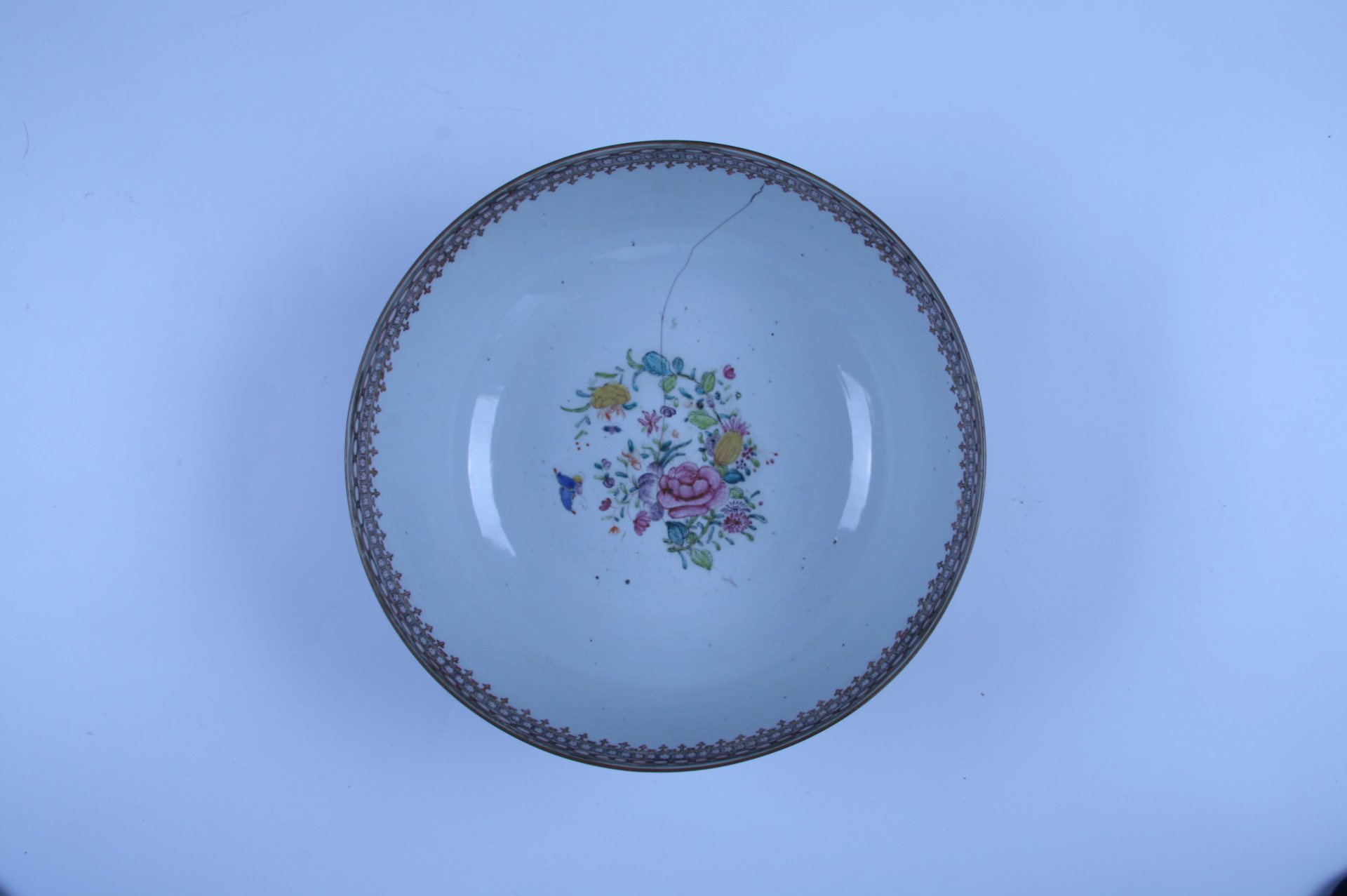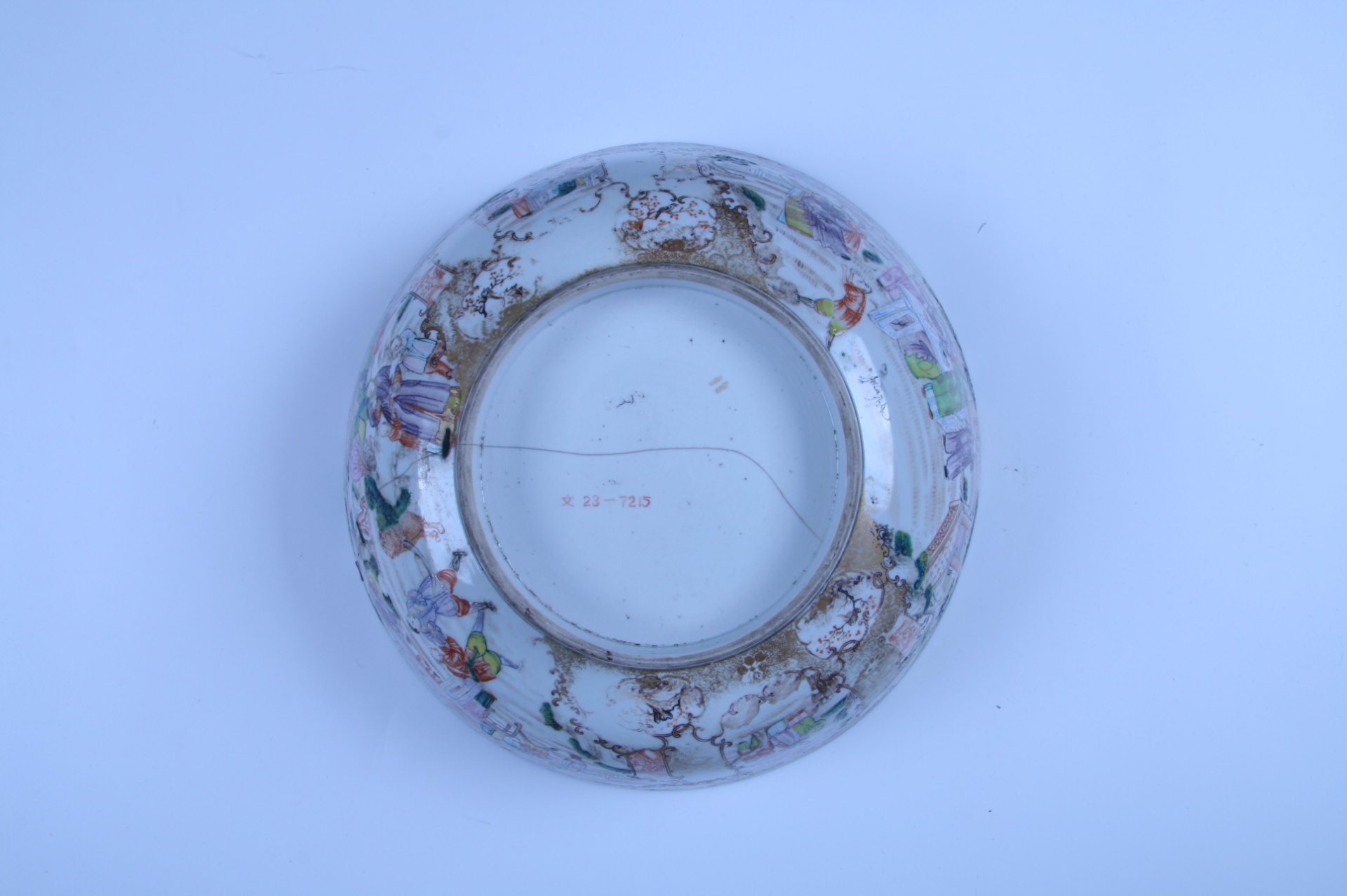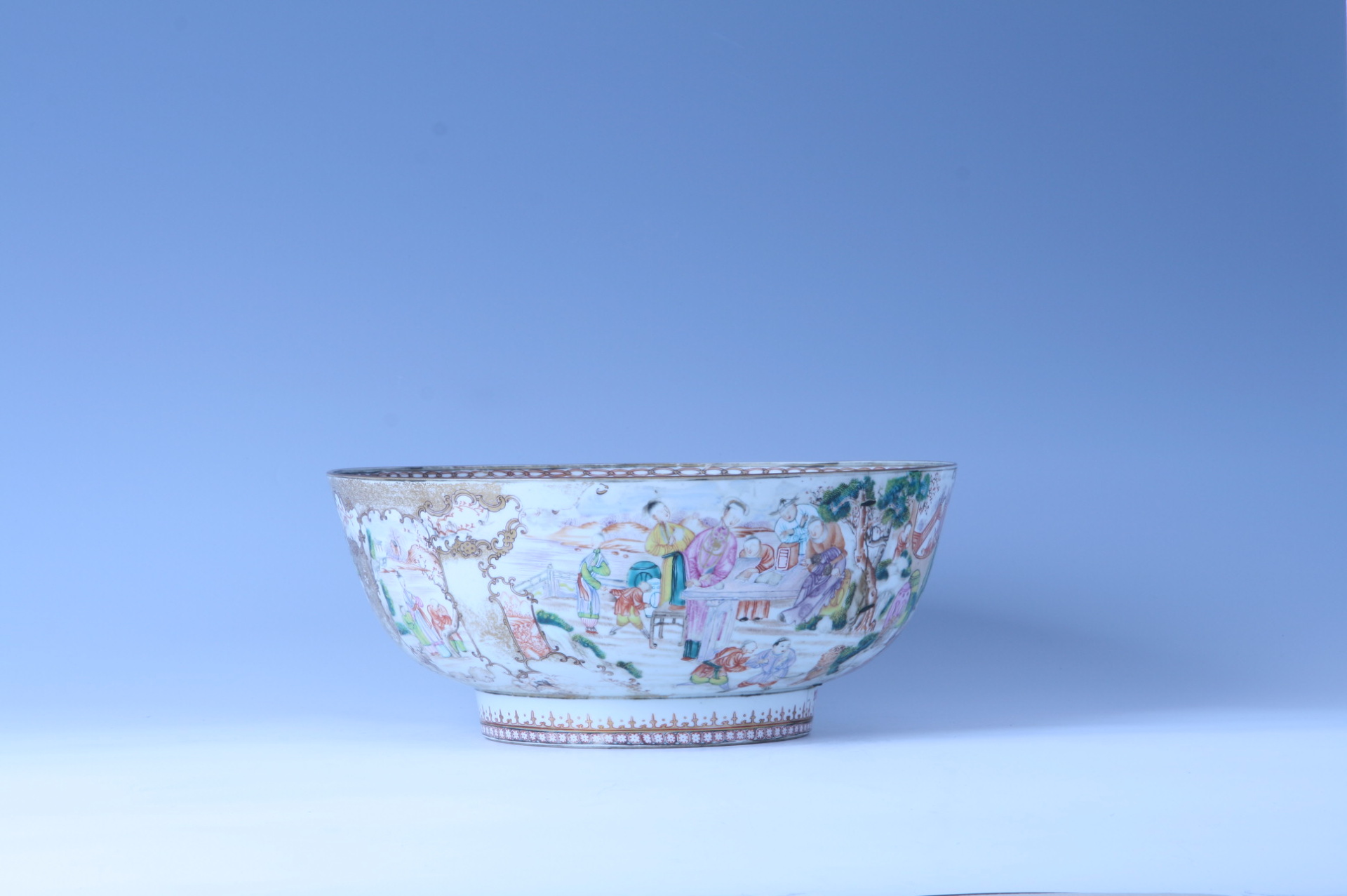 碗直口,深腹,圈足。内口沿与底足处饰有一周红彩边饰图案,辅以金彩勾边。碗内心绘有折枝花卉蝴蝶纹。其外腹部饰有多组人物故事图,背景为楼台长廊、庭院园林。画面生动细腻地反应了当时中国官宦家庭的和睦生活。此碗画工精细,用彩明亮,中西风格兼具,时代特征明显。