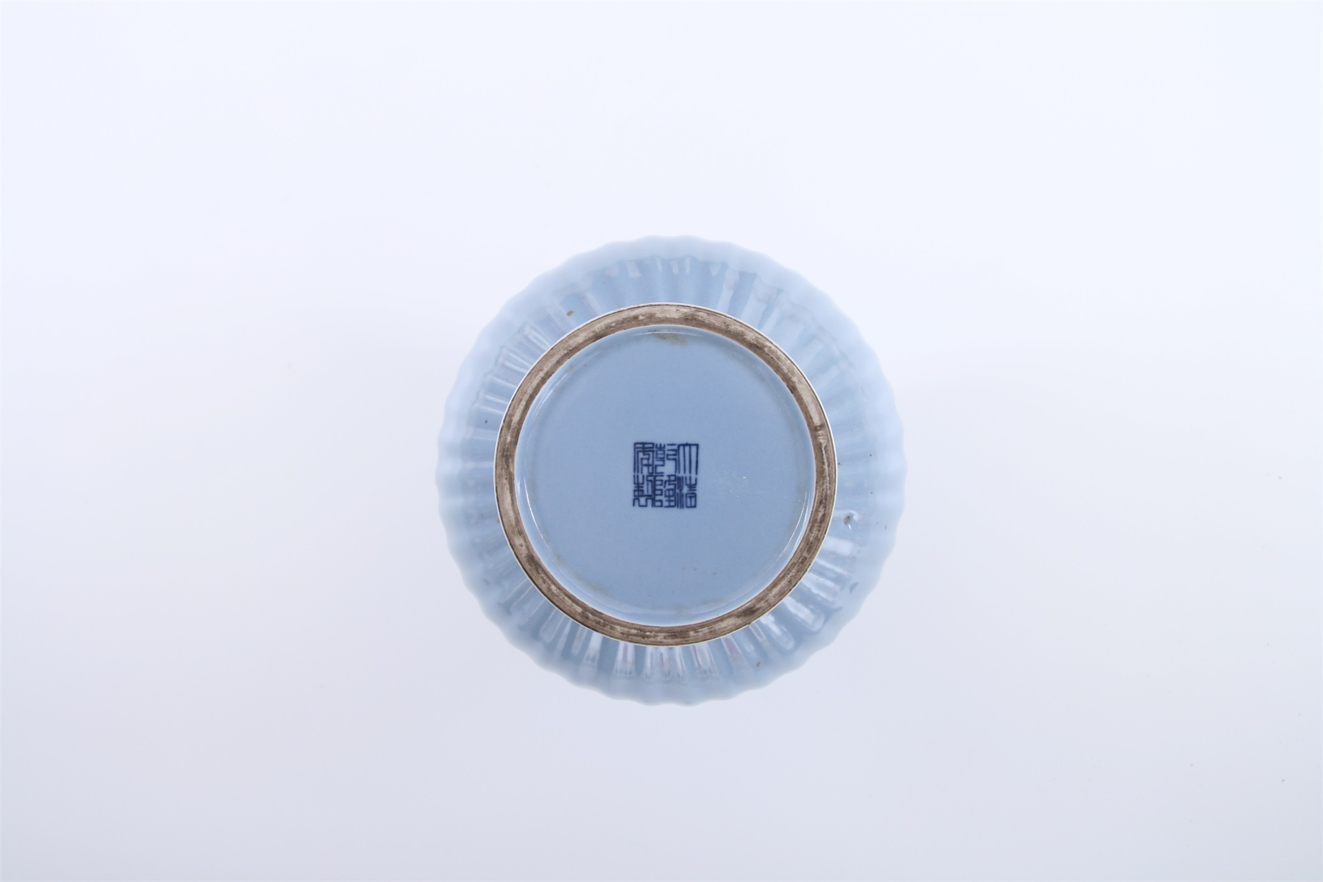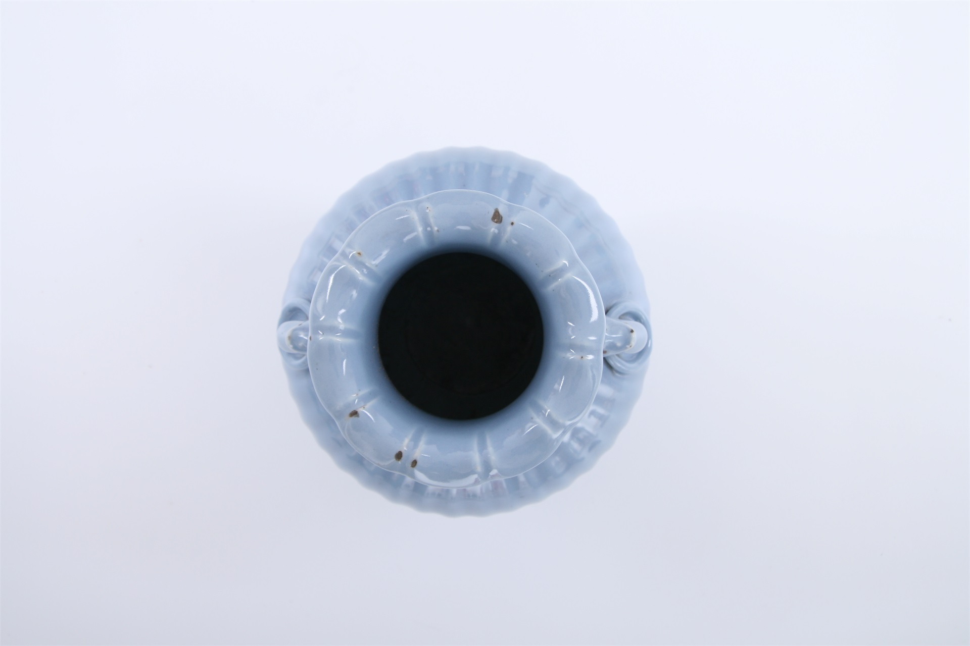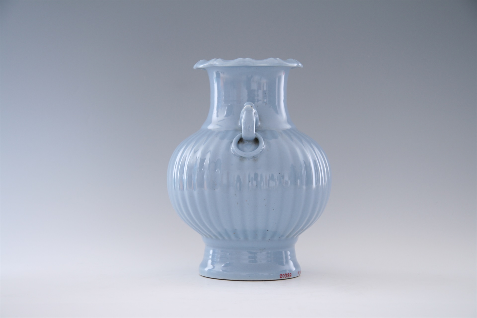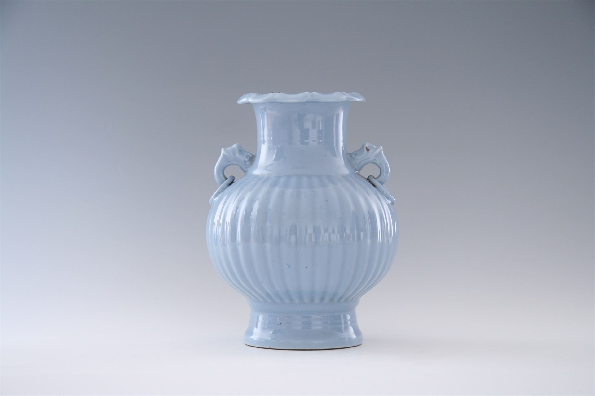 瓶花口折沿,阔口外撇,直颈,圆肩,颈部饰多道弦纹,颈与肩部饰对称象鼻衔环耳。球形腹,腹下收,假高圈足外撇。外腹饰菊瓣形凸棱,棱条随器壁弧度而宽窄,器内外施天蓝色釉,釉色细腻光亮,足底刮釉,胎色灰白,胎体细腻坚致。底中心青花篆书“大清乾隆年制”六字款,形制规整,端庄秀丽。