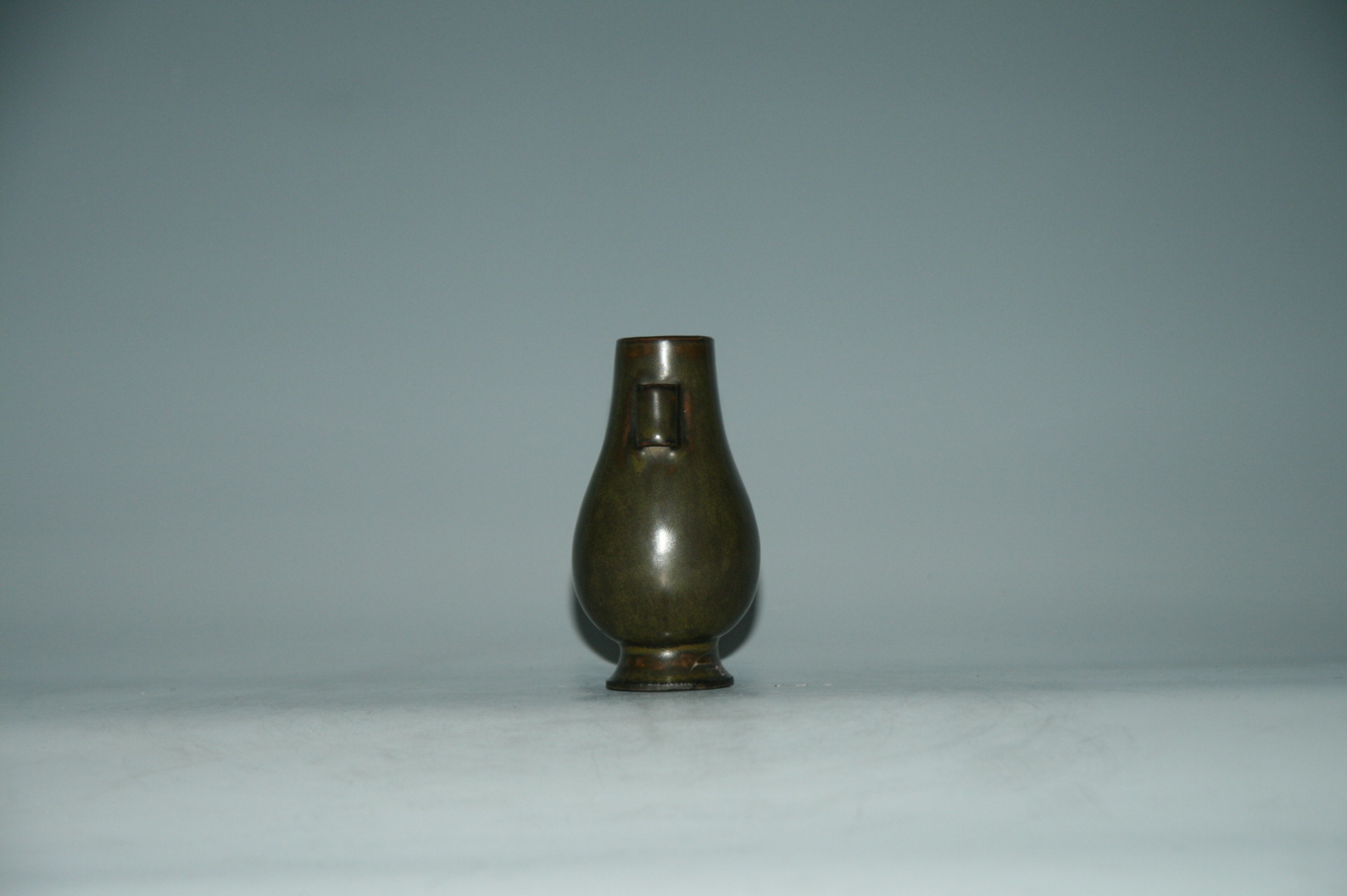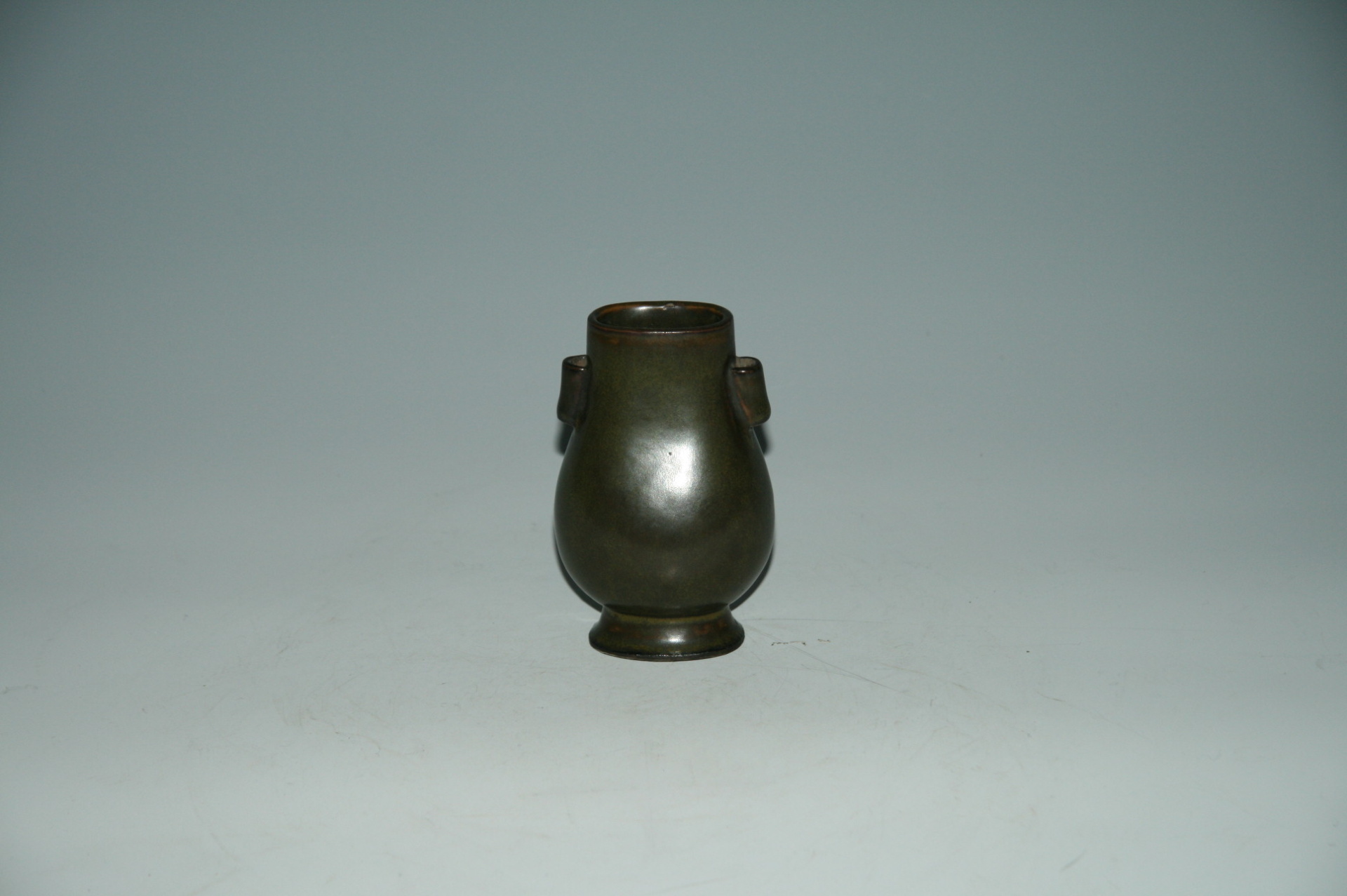 瓶椭圆形直口,圆唇,高颈,颈以下渐广,溜肩,颈与肩部饰对称长方形贯耳,腹部扁圆,下垂急收,椭圆形高圈足外撇,足底刮釉,灰色厚胎,器内外均匀施鳝鱼黄釉,釉质细腻匀净,莹润光亮,色泽柔和,底心内阴刻篆书“乾隆年制”四字款。形制规整精细。