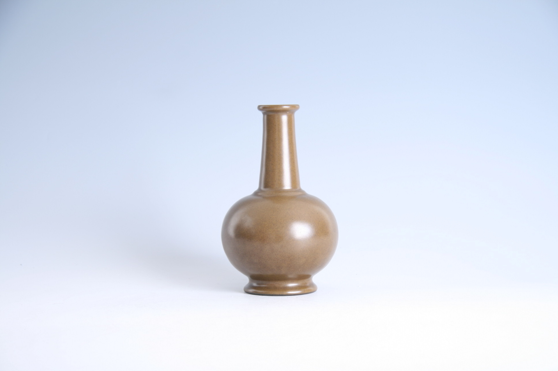 瓶唇口,长颈,球形腹,圈足外撇。肩部饰有一道宽凸弦纹。器形规整,线条简练。满施茶叶末釉,釉色均匀,光泽厚润柔和。底部中心刻有“大清嘉庆年制”篆书款。