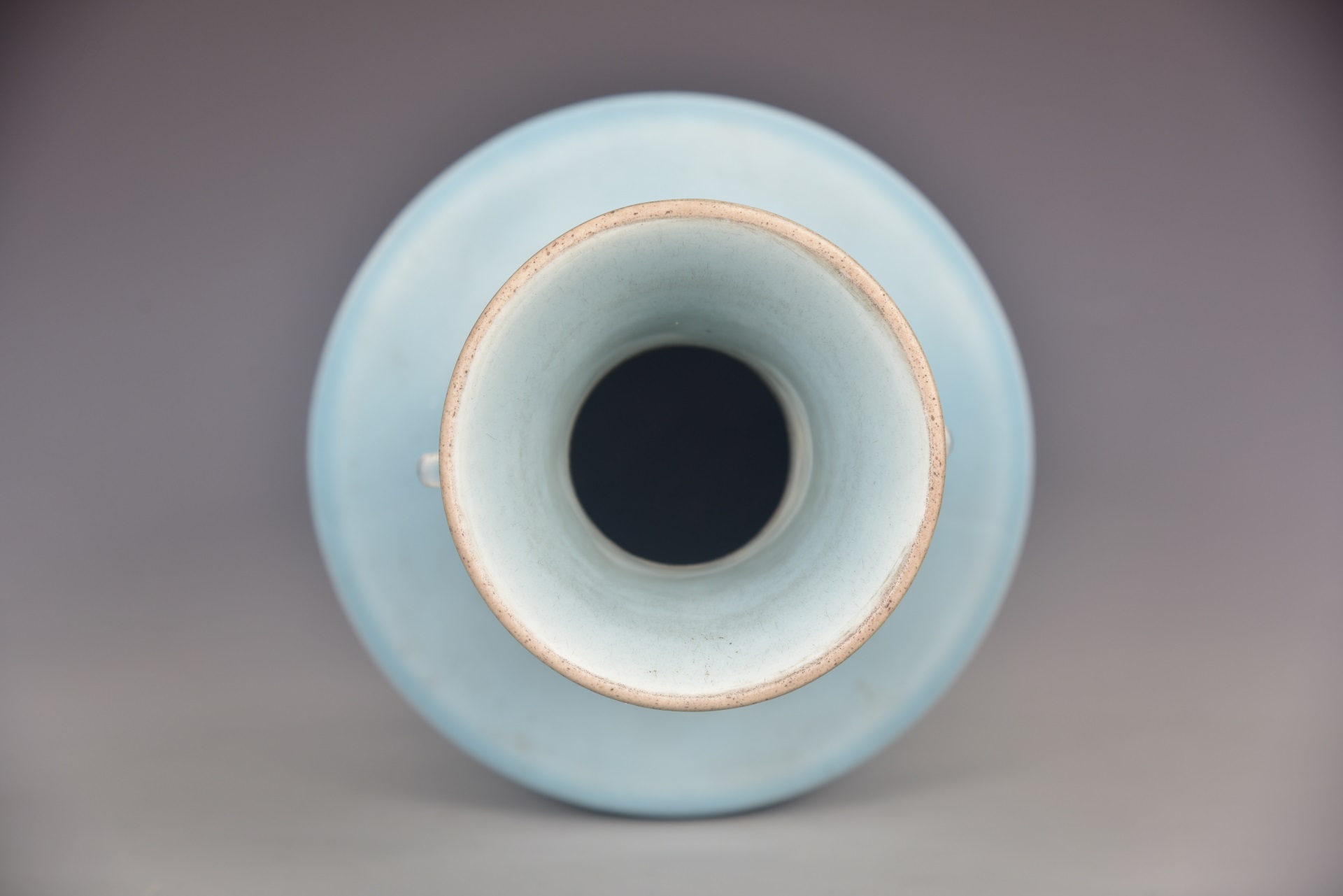 瓶撇口,长束颈,颈上塑有双螭耳,折肩,鼓腹,下渐收敛,圈足外撇。通体施天蓝色釉,釉色莹润光亮,匀净典雅。螭耳、折肩等凸处,釉质稀薄,微微泛出胎的白色。近足处形成一周积釉,颜色较深。器底刷有褐色护胎釉。