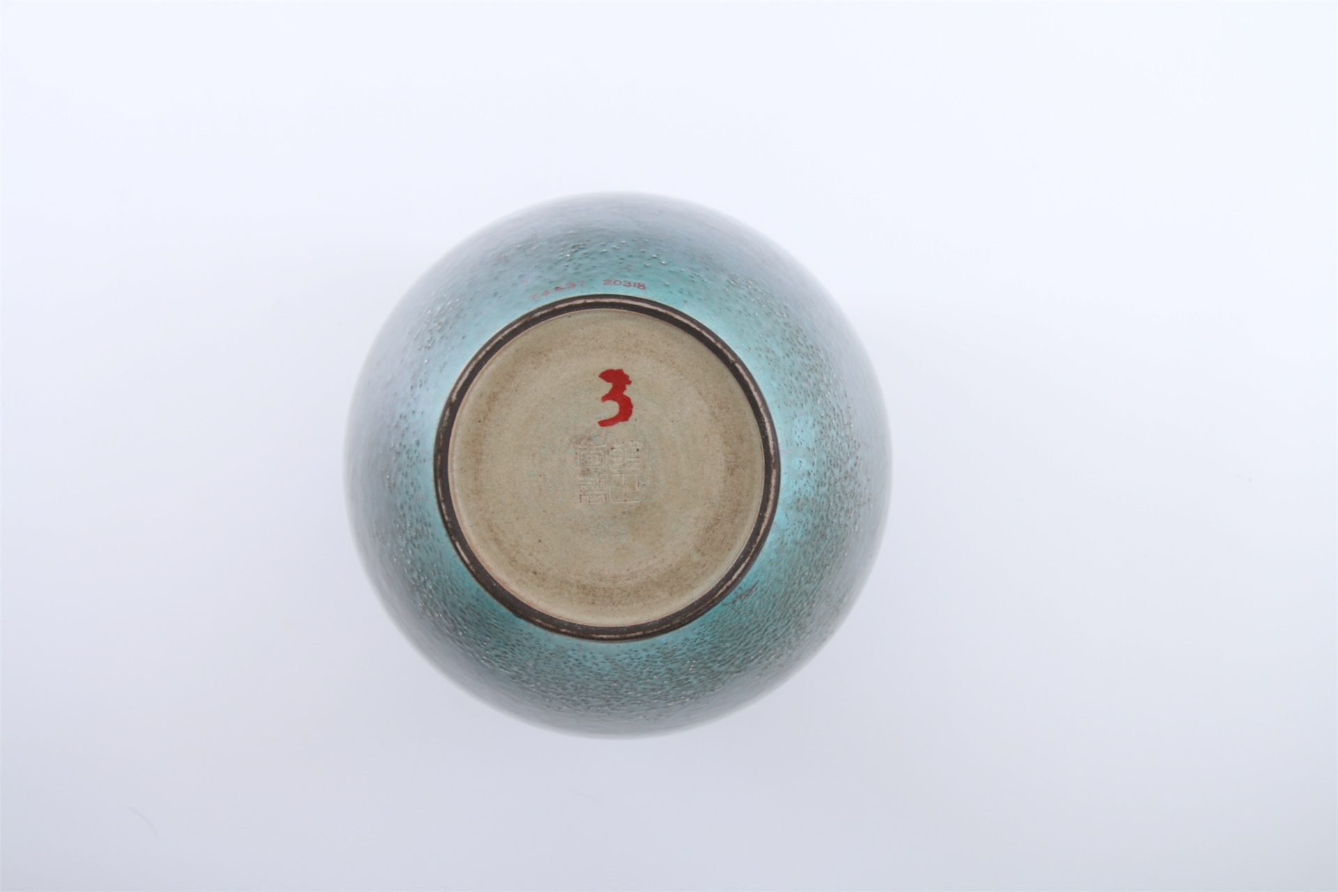 罐口微侈,圆唇,短颈,丰肩,腹下收,平底内凹。器内施蓝釉,腹部有轮制痕迹。器外釉面呈蓝、褐色斑纹,颈部可见沙眼。外底露胎,不施釉,底内有阴刻“雍正年制”篆书四字款。胎体浑厚,器型规整。
