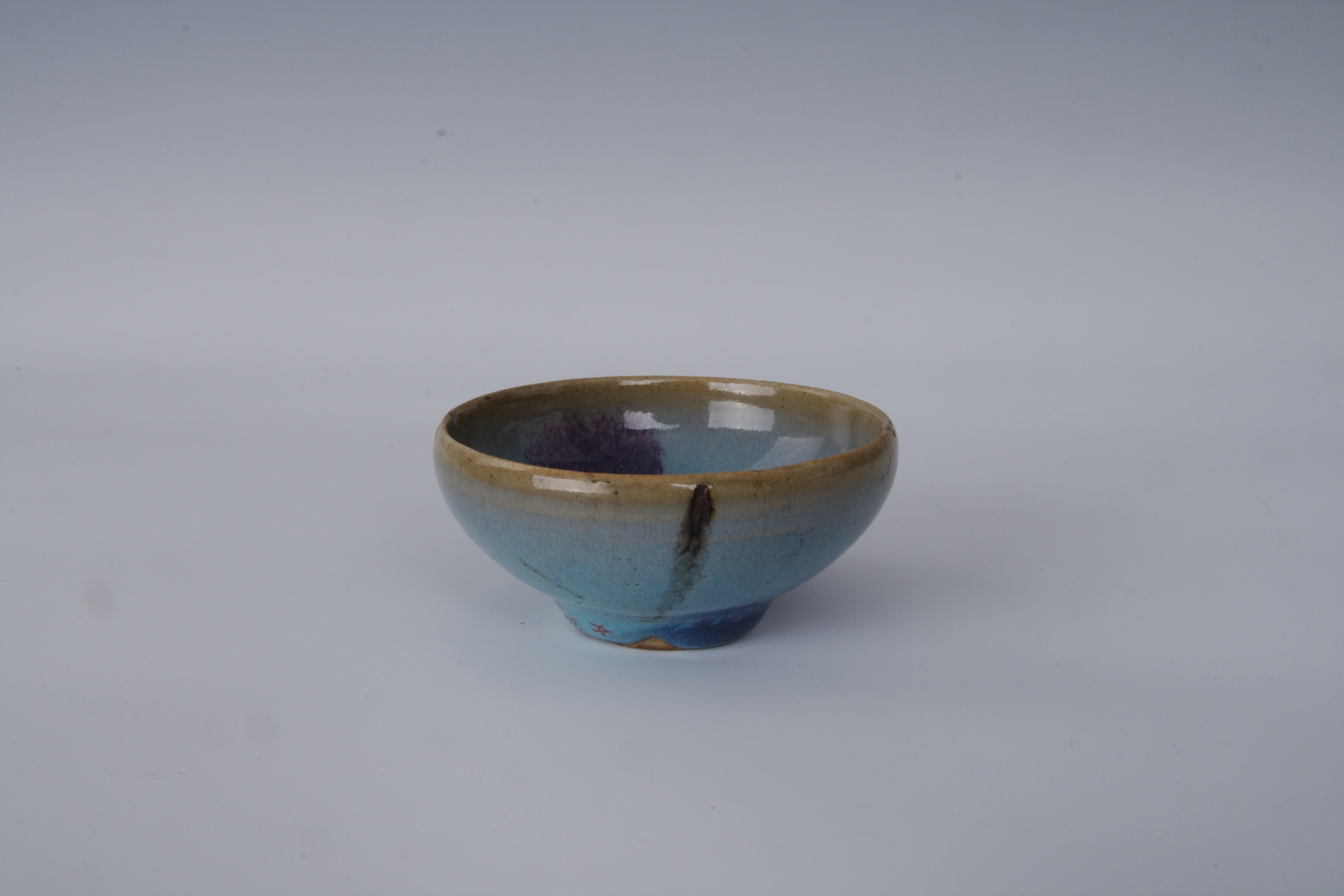 碗敛口,深腹,小圈足。通体施淡蓝色釉不到底,碗心及外围有窑变玫瑰紫色彩斑,蓝紫相称,美不胜收。本器造型优美,线条流畅,小巧玲珑,制作规整。