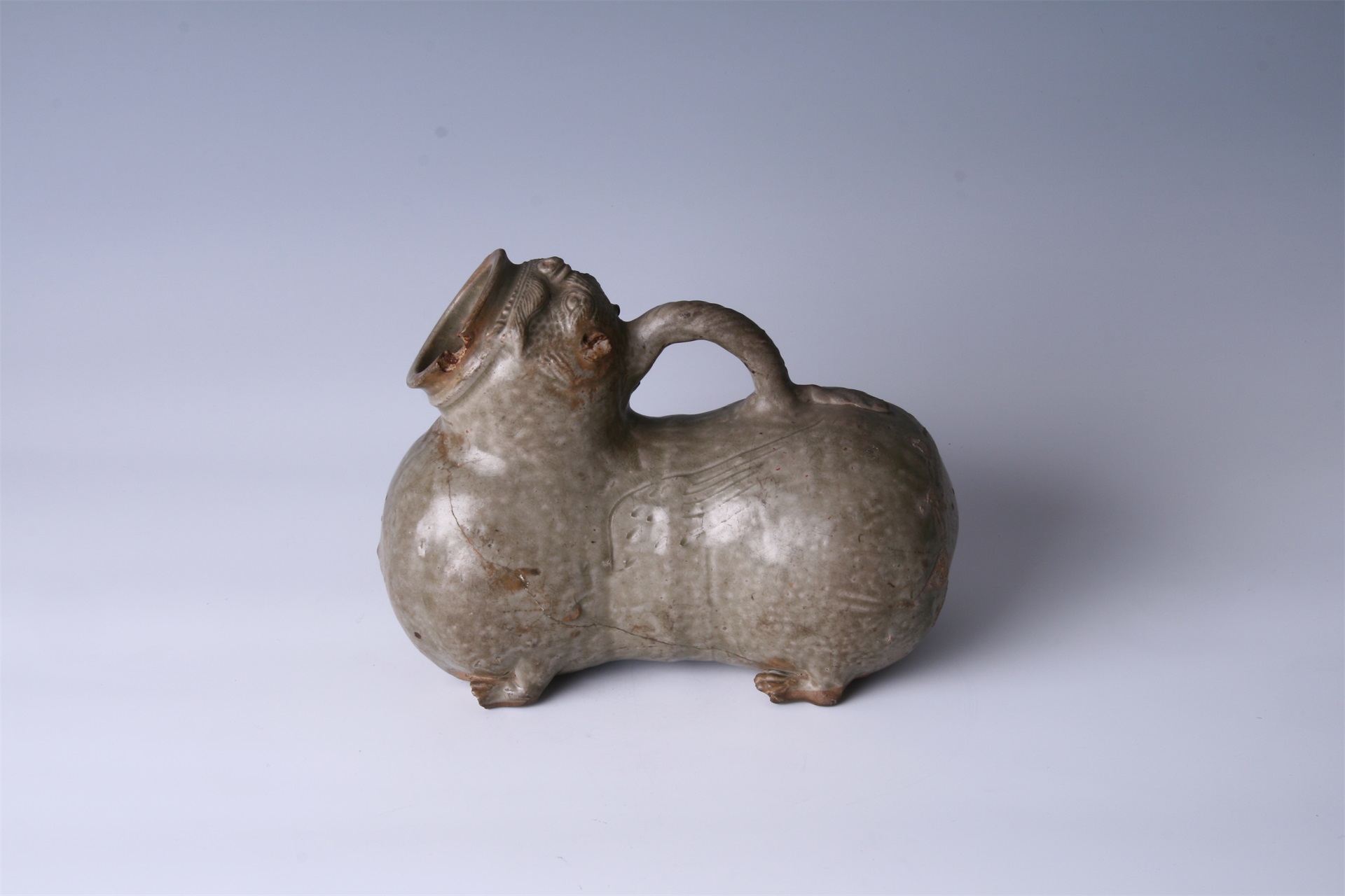 器形似一只昂首蹲伏的猛虎,虎口为流,头作45度角上仰,圆口方唇,鼻孔上仰,双目圆睁,双耳竖起,虎身束腰收腹,腰间双侧刻划双翼,四肢呈蹲曲状。背部塑有一绞索纹环状提梁,便于提拿。通体施青釉,莹润光亮,器下部露胎,胎质紧致细腻。