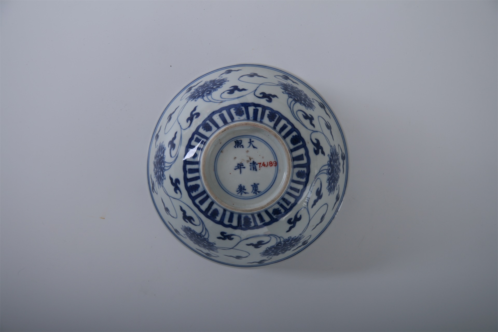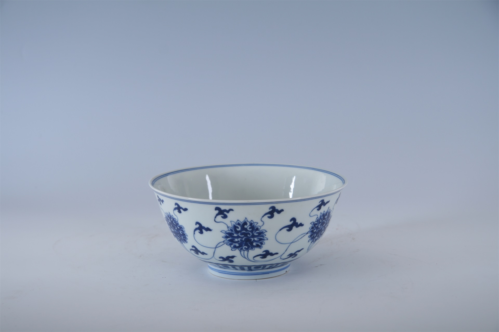 碗敞口,弧腹,圈足。通体以白釉青花为饰,釉面莹润光亮,青花发色艳丽。内口沿饰细弦纹二道,碗内底双圈内绘有莲纹,外口沿与足墙上各饰有双线弦纹二道,腹部饰六组缠枝莲纹为主题纹饰,腹下部饰变形莲瓣纹一周。器底青花双圈内署“大清康熙年制”楷书款。