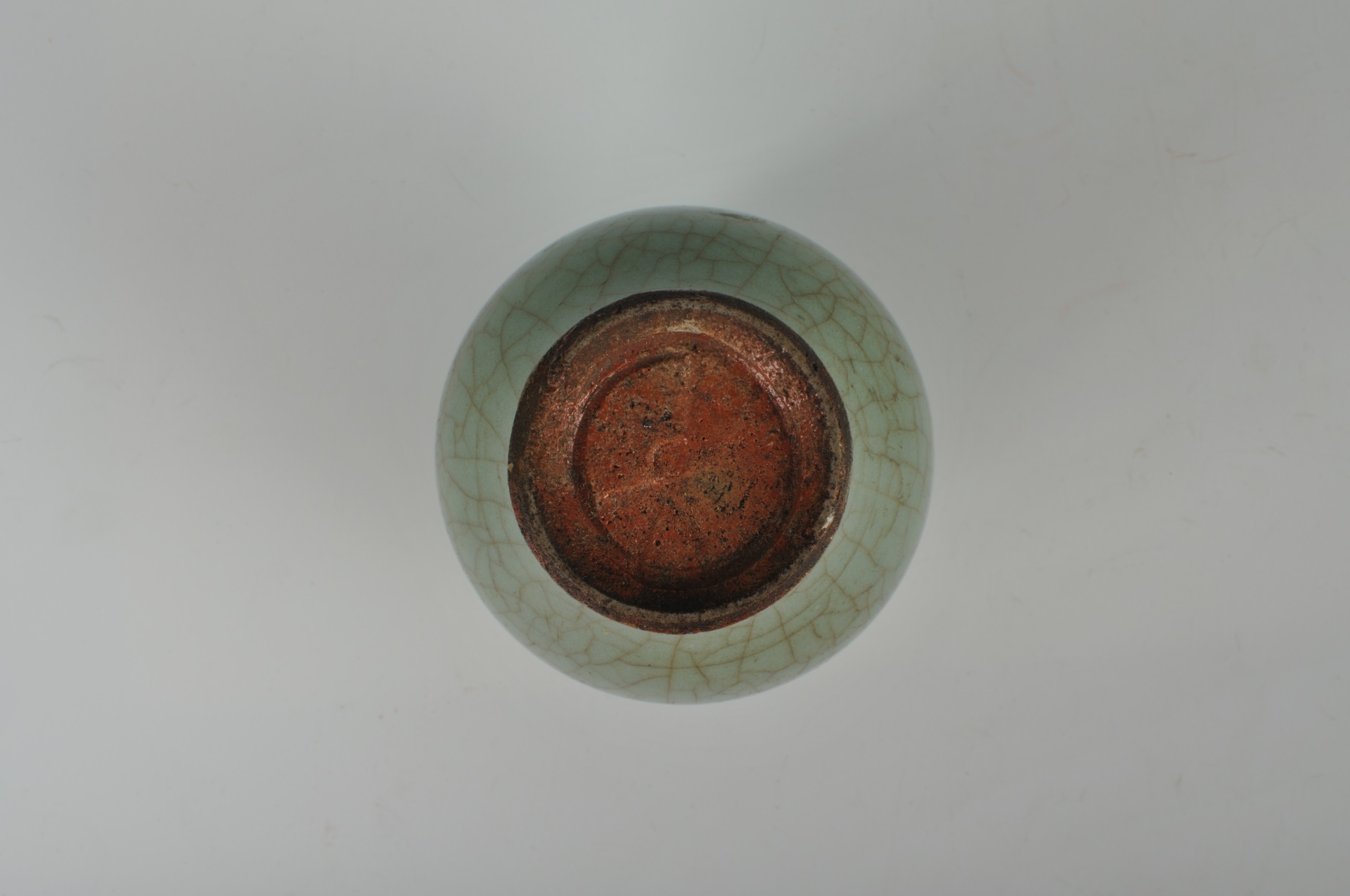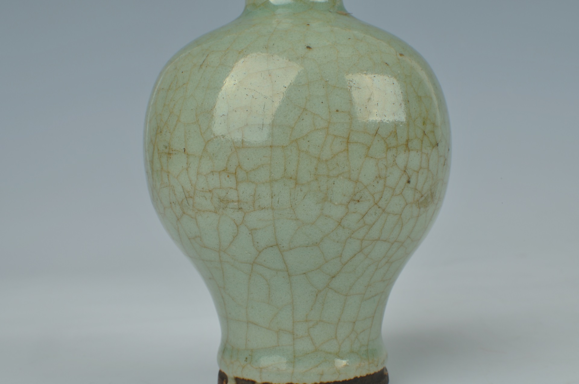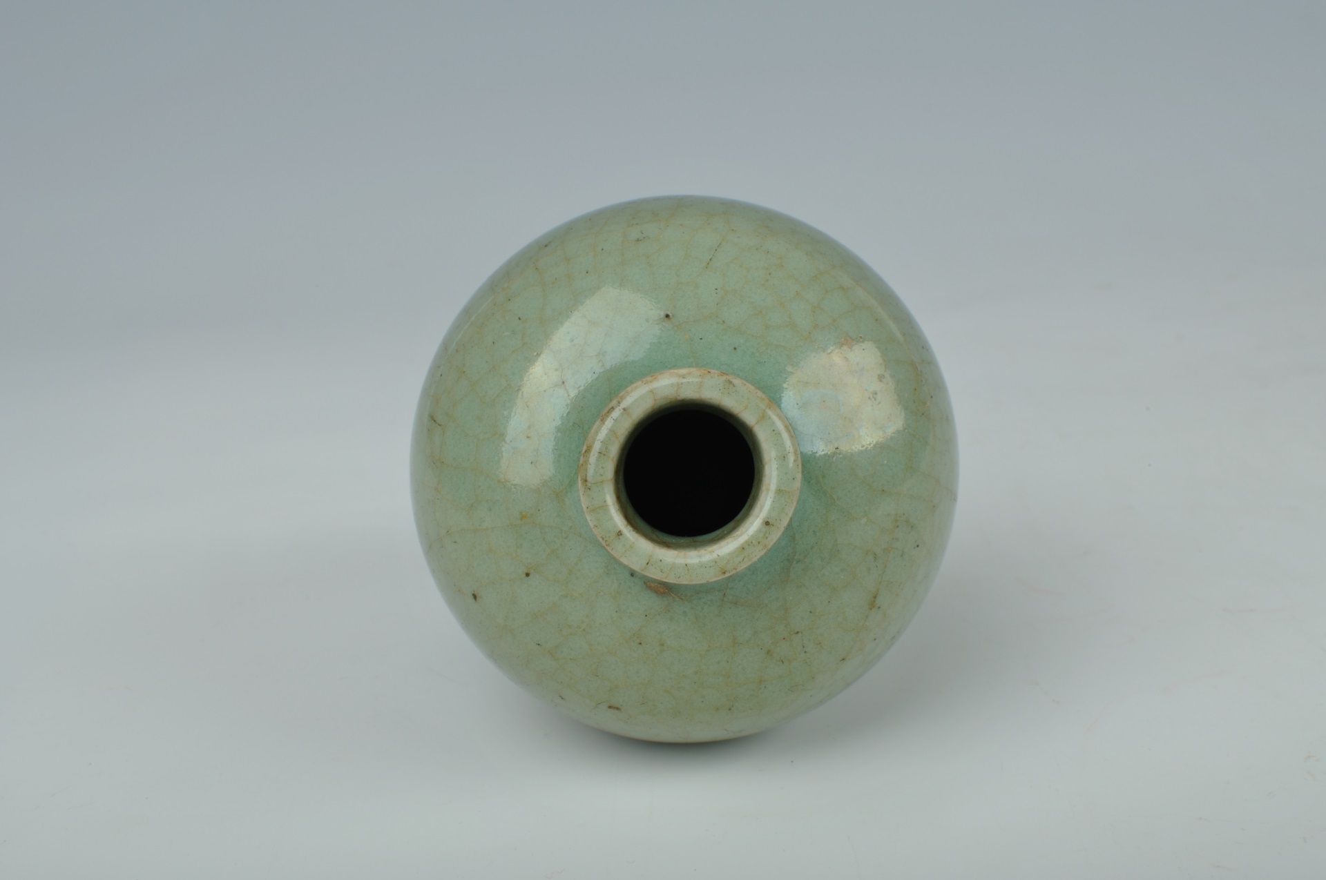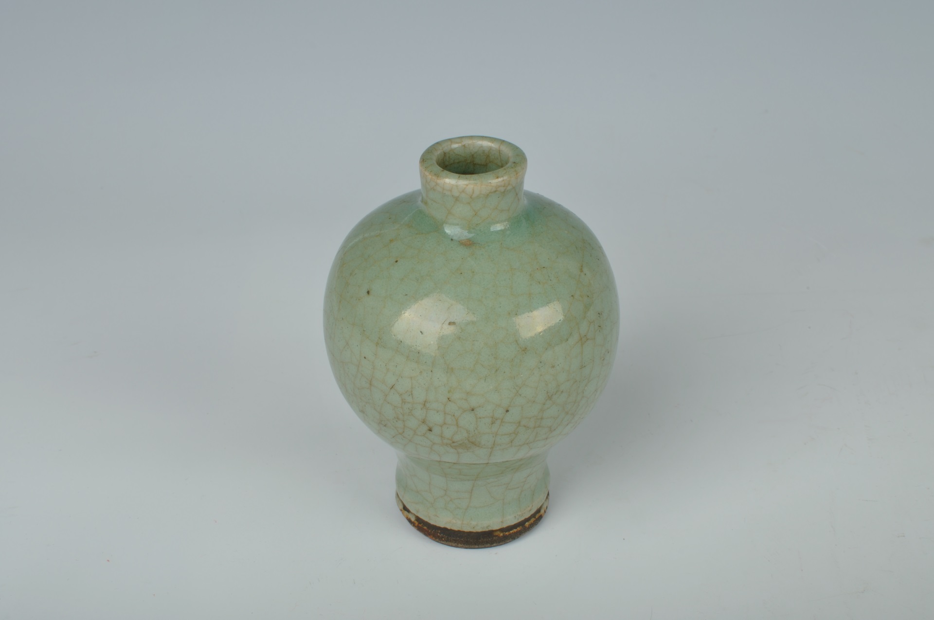 瓶小口圆唇,直颈,溜肩,圆鼓腹,腹下急收,圈足。通体施青釉,釉质凝厚滋润,釉色青中微微泛蓝,器身布满开片,底足处露胎,胎色黄褐,质地坚质。器物造型小巧玲珑,曲线秀美,制作工整。