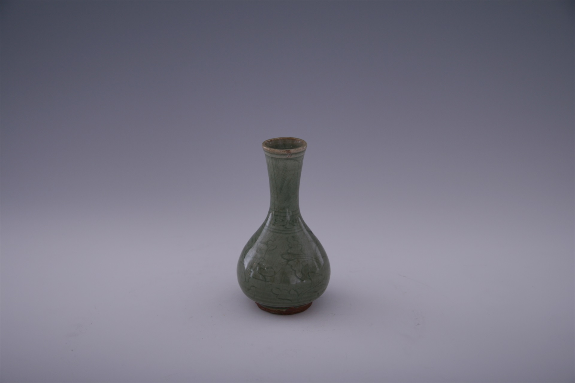 瓶口呈喇叭状,长颈,溜肩,垂腹,圈足。胎体厚重,器底无釉处可见火石红色。通体在器胎上刻划纹饰,腹部主题纹饰为牡丹花,其刀法娴熟,刻划流畅。器身满施青釉,釉色青绿,釉面光亮,开有冰裂纹。