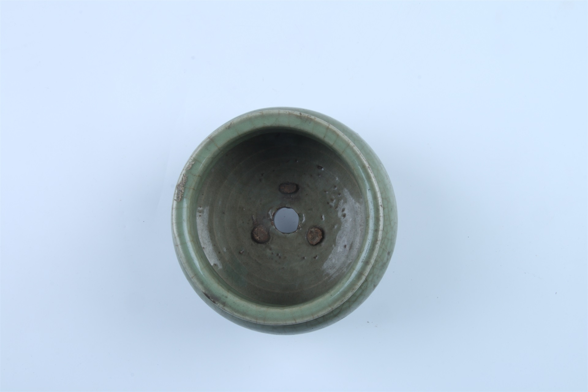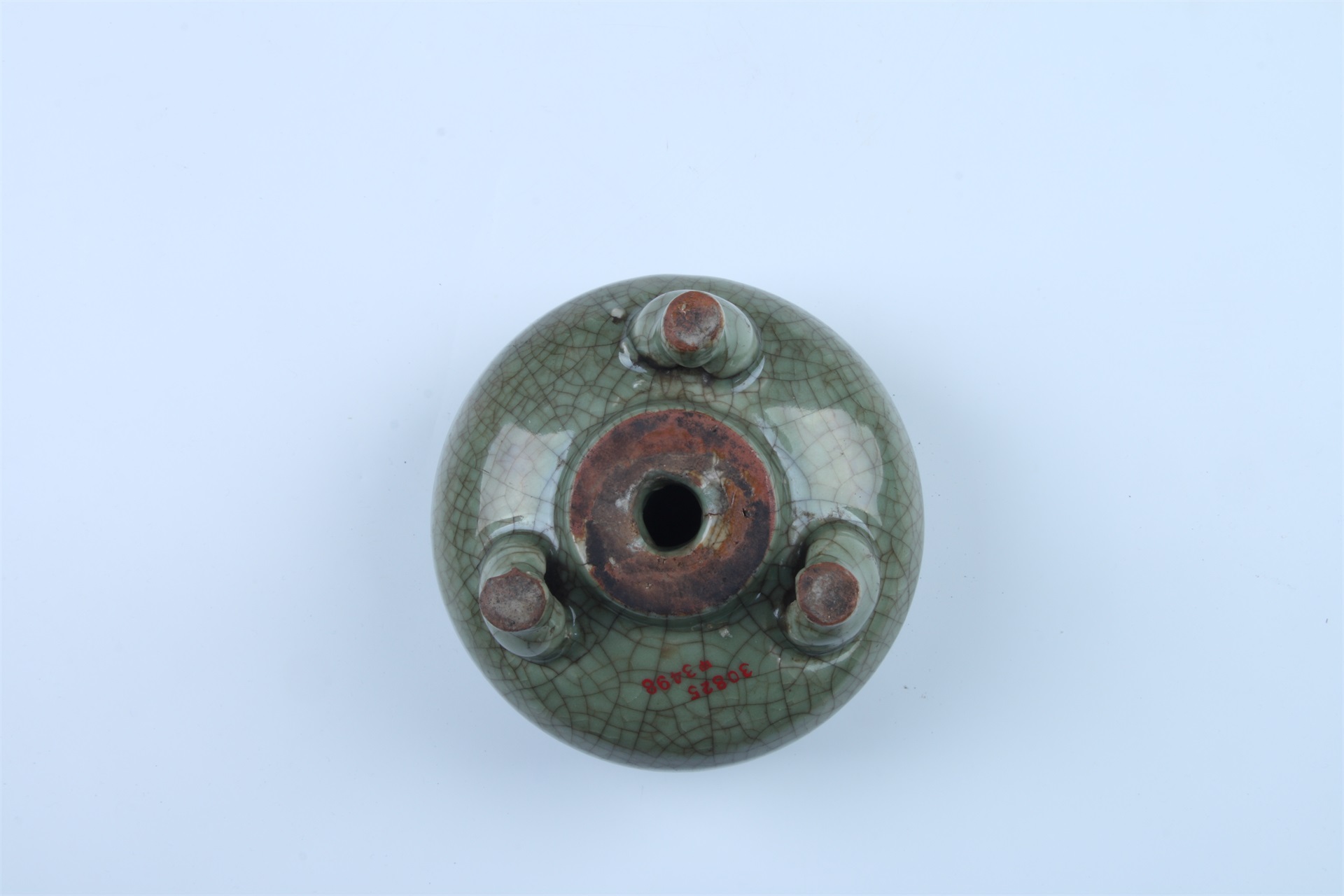 炉圆唇外卷,直颈,溜肩,扁腹,平底中心有圆孔,三蹄足。通体施豆青色釉,釉色润泽,釉层肥厚,釉面开有大小不一的冰裂纹。炉内心与外炉底、足端无釉露胎处呈火石红色,胎质较为紧密。器内底有三个支钉痕。