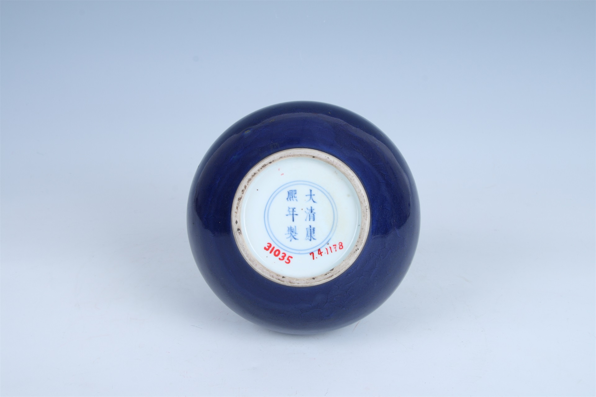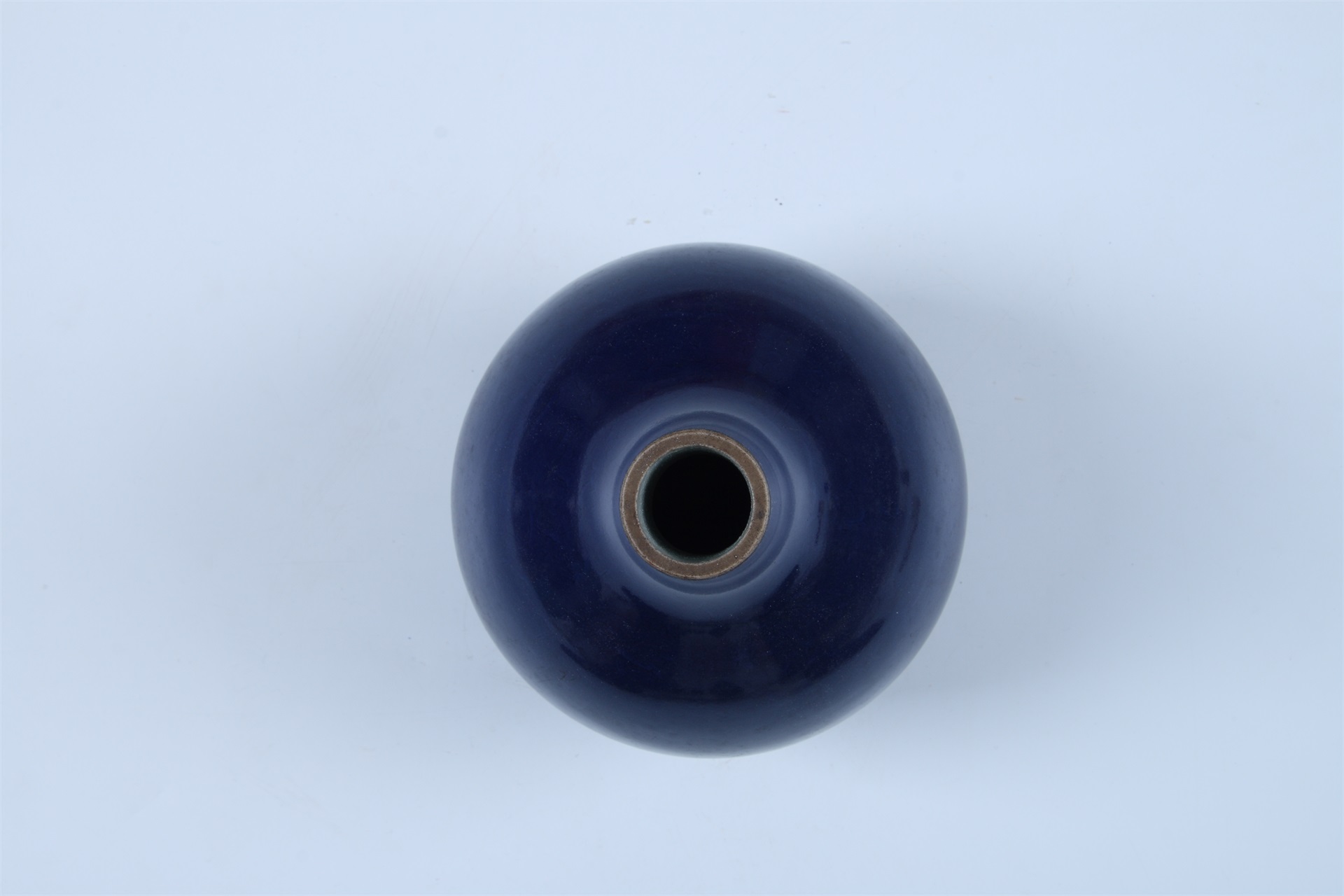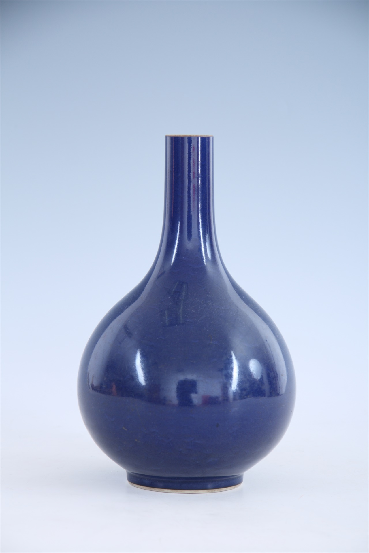瓶直口,长直颈,垂腹,圈足。器内与底足内施白釉,器外施霁蓝釉,有垂釉现象,釉质光亮、匀净,发色深沉。器胎质细腻洁白,紧密坚质。底部青花双圈内署有“大清康熙年制”六字双行楷书款。