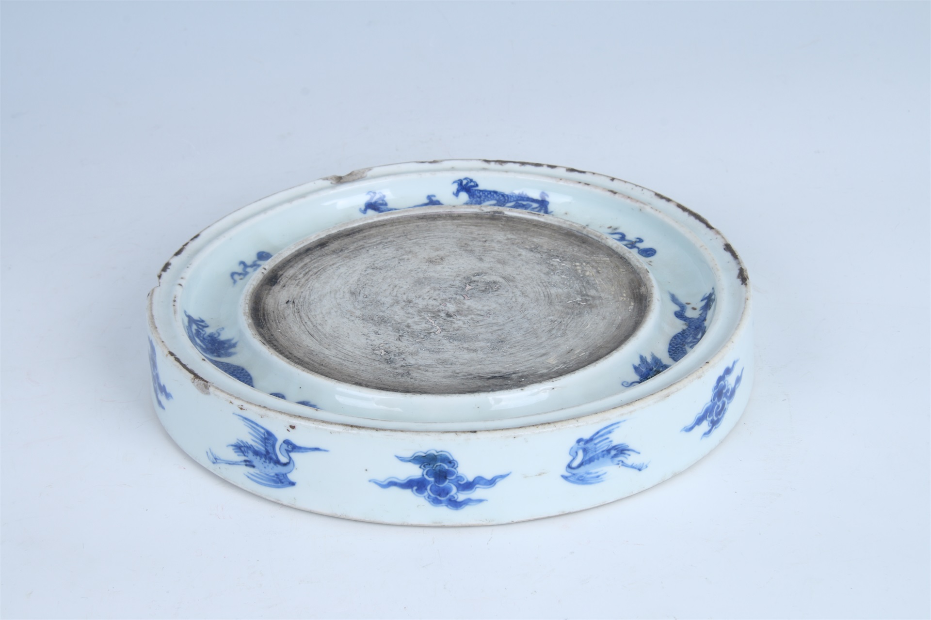 砚为圆形,实腹,圈足。通体以白釉青花为饰,釉面莹润,白中微微闪青,青花发色艳丽,胎白质坚。砚面周围为一圈凹槽式砚池,砚池内绘火珠龙纹,外壁绘云鹤纹。所绘纹饰布局清朗,线条流畅。砚底有青花款“石著墨而黑,邪心谗言,无得汙白。”