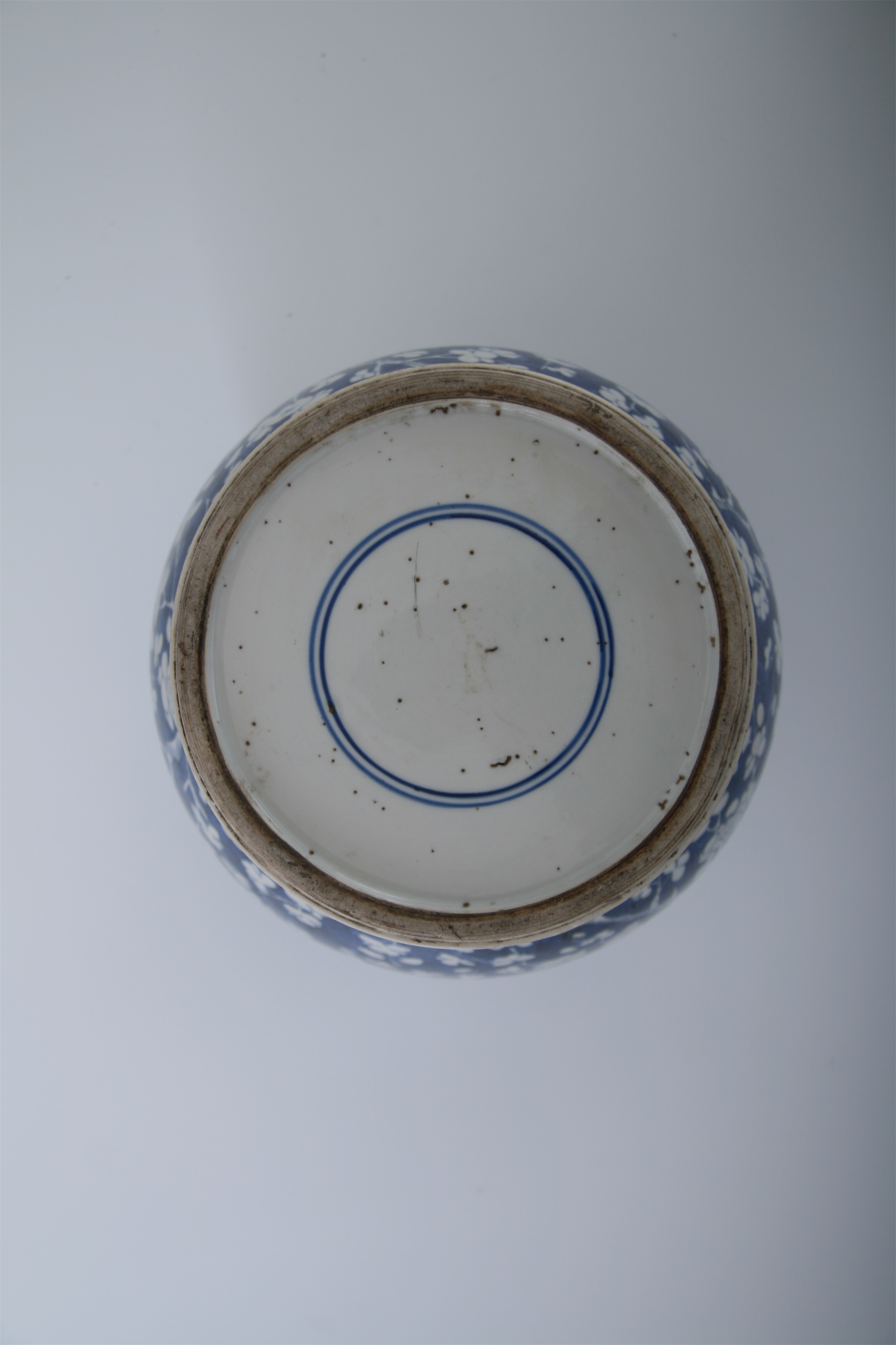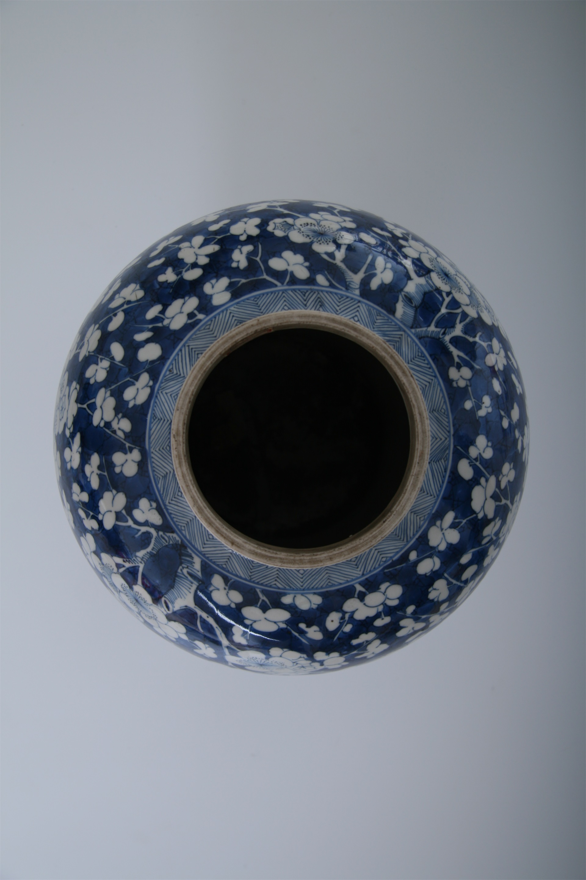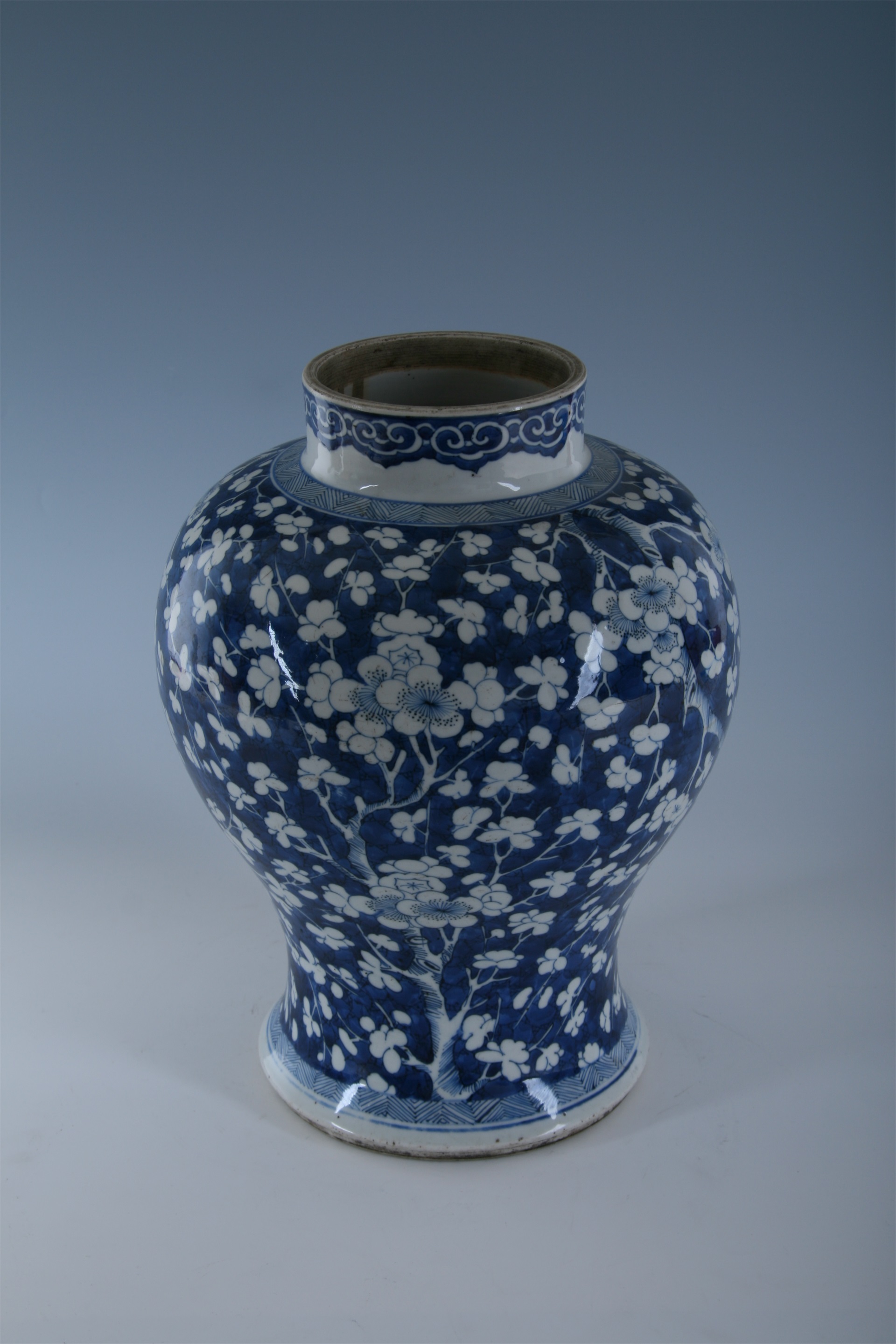 瓶直口,短颈,丰肩,鼓腹,腹下渐收敛,近足处外撇,二层台式足。通体以白釉青花为饰,颈部饰有一周如意云头纹,肩部与足部饰席纹,器身满饰冰梅纹,青花发色深沉,釉质细润,釉色光亮,纹饰绘制清晰。