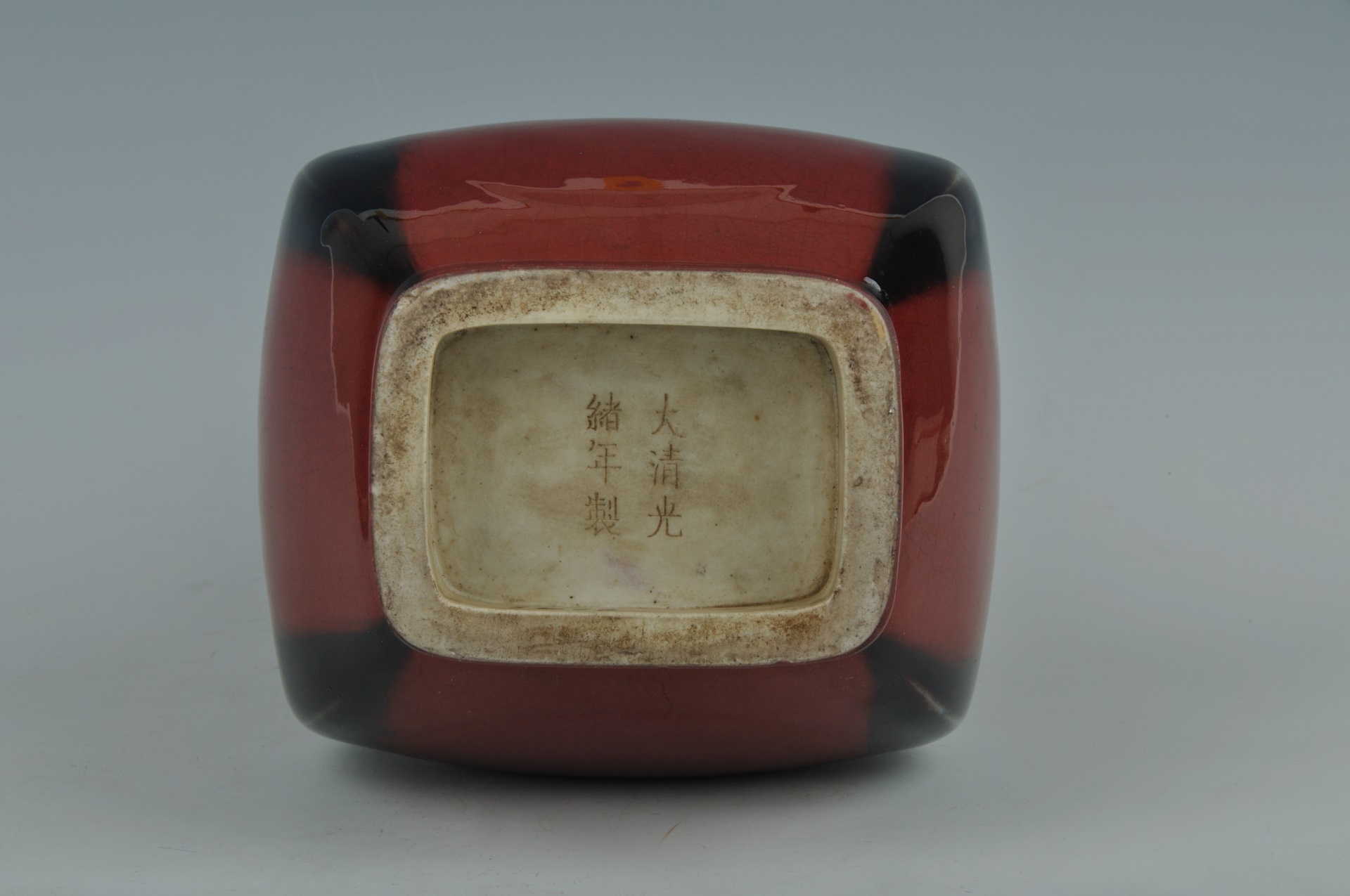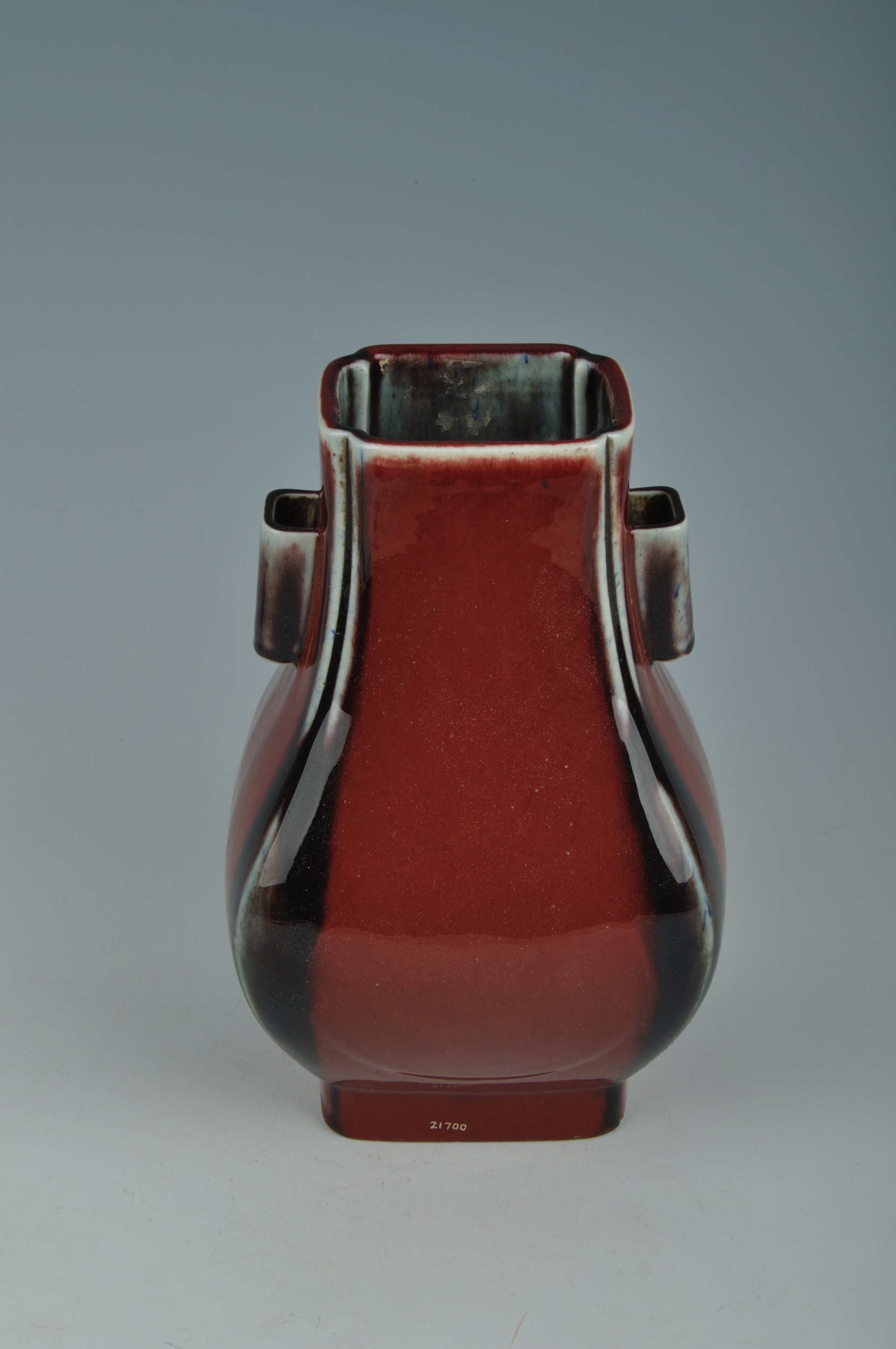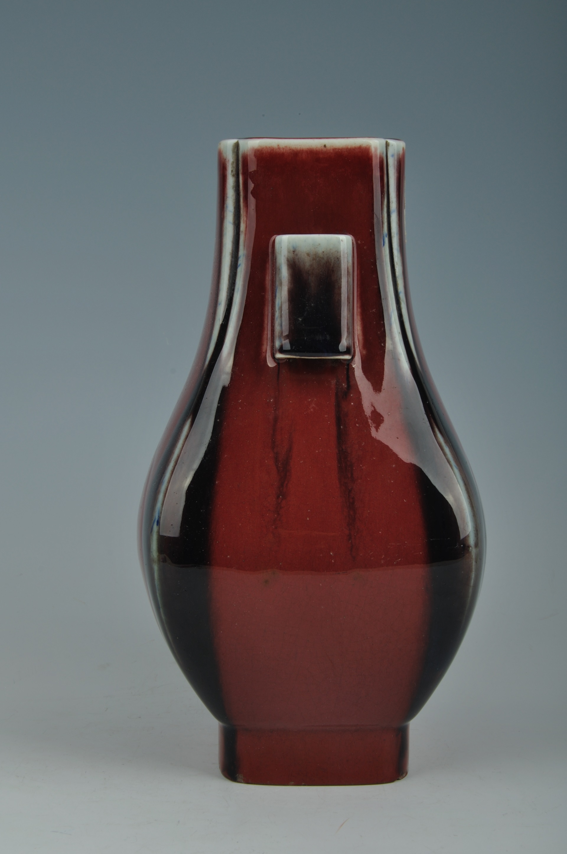 瓶口部呈四方倭角形,颈部饰有对称双贯耳,溜肩,扁圆腹,腹部中心有杏圆形凸起,长方形圈足,足内底心刻“大清光绪年制”双行六字楷书款。器通体施窑变釉,以鲜红色为基调,棱角处间有黑色或露出胎体的白色,釉面凝莹光亮,釉质肥润厚重,凸显出典型的晚清窑变釉风格。