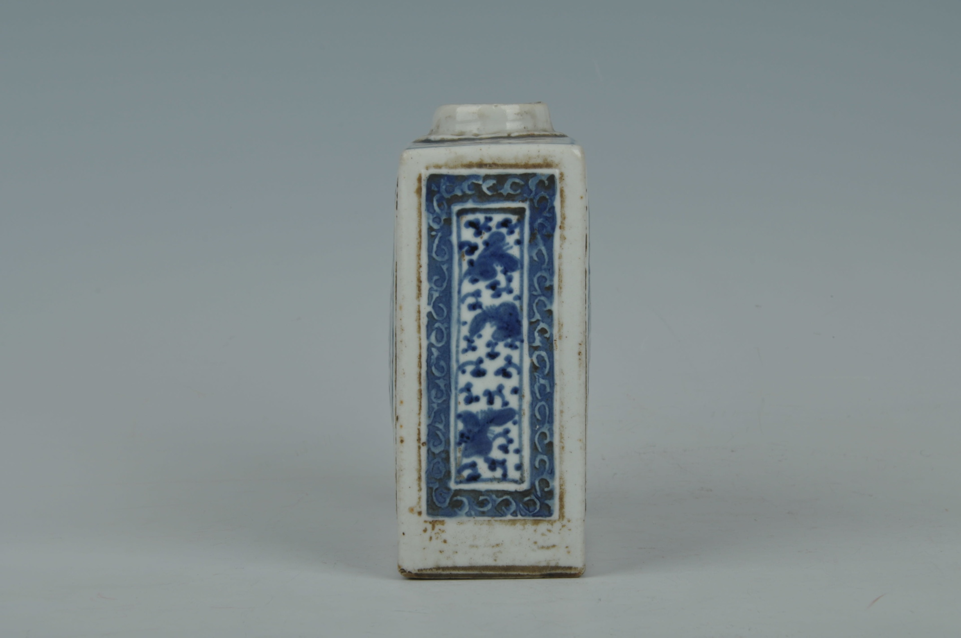 方形扁瓶,直口微敛,方形矮圈足。器身正面与侧面饰有对称青花缠枝花卉,边饰一周卷草纹。圈足底饰青花树叶压花款。