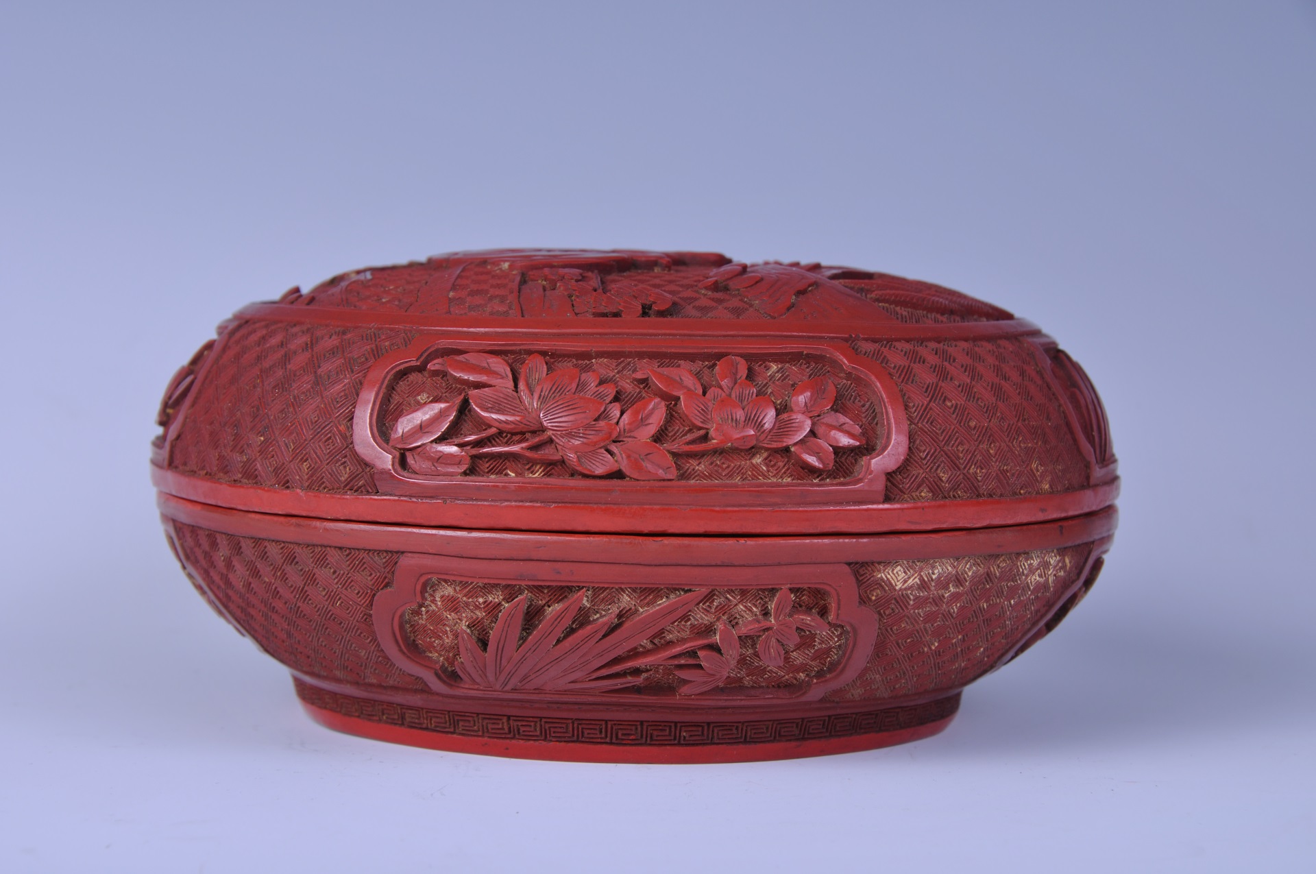 盖盒外髹红漆,盒内与外底髹黑漆。以回纹作锦地,盖面圆形开光内刻山水人物纹,盖和盒身外壁各有四组开光,开光内各刻折枝花卉一组,圈足上雕回纹一周。