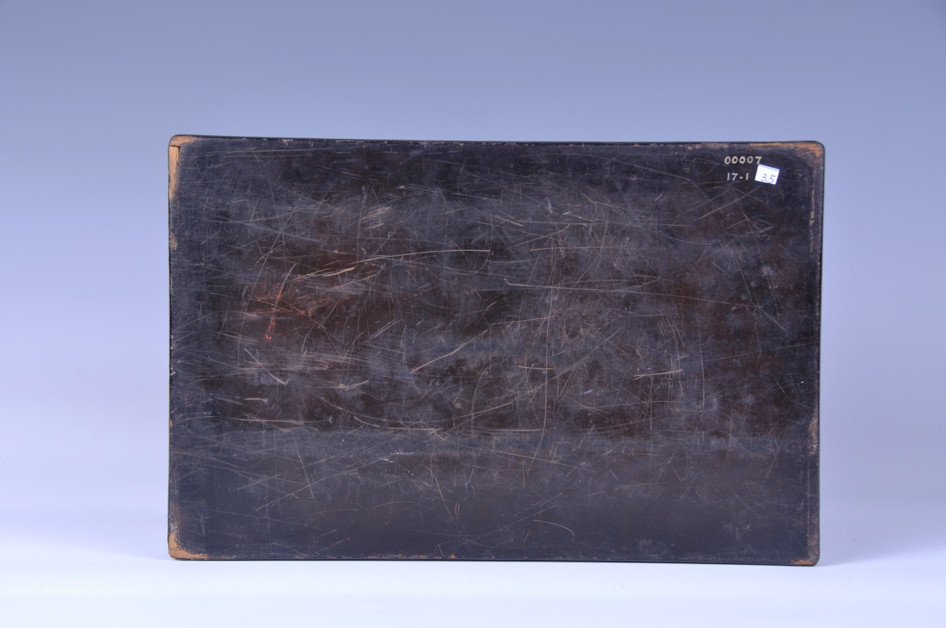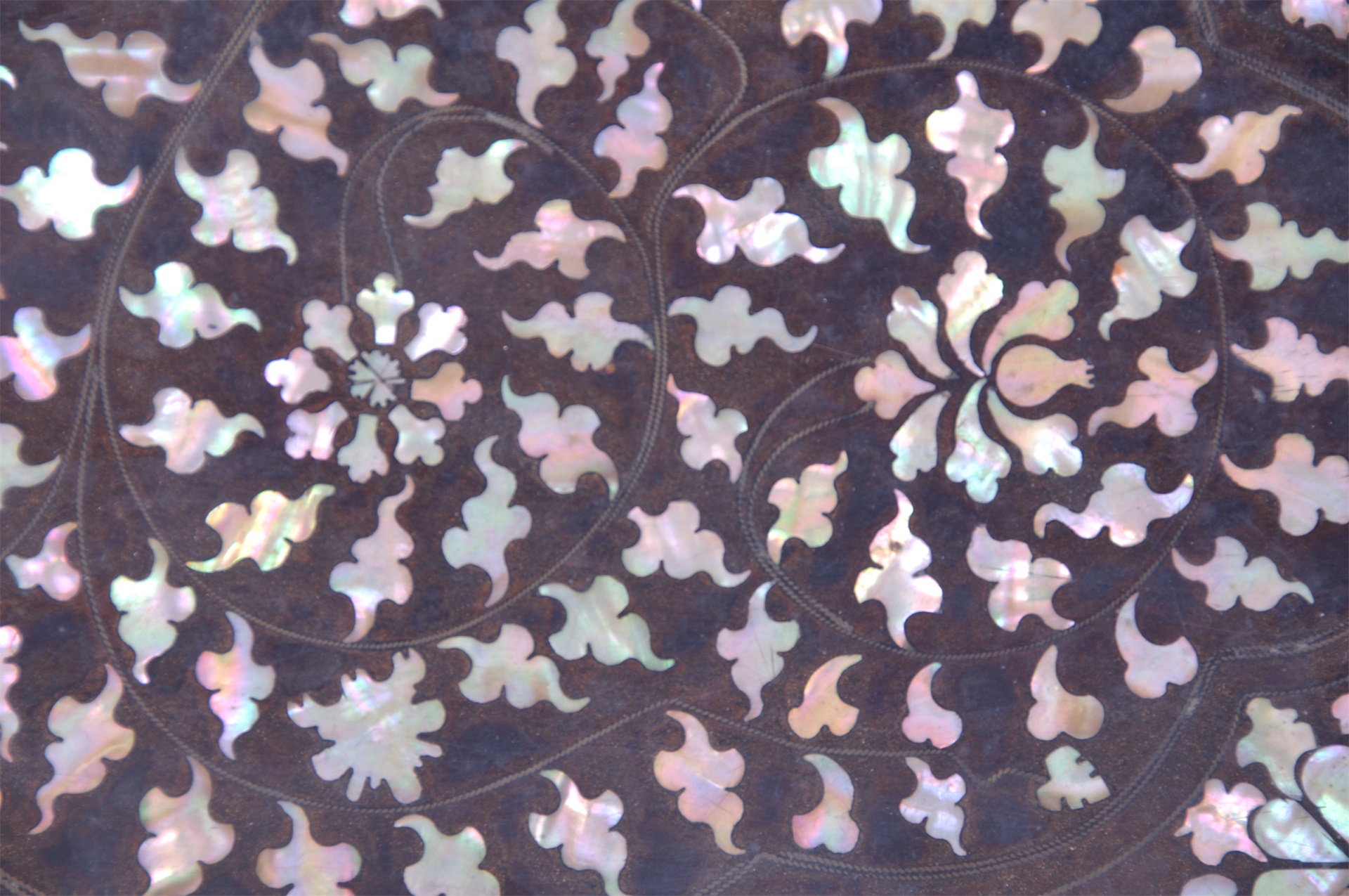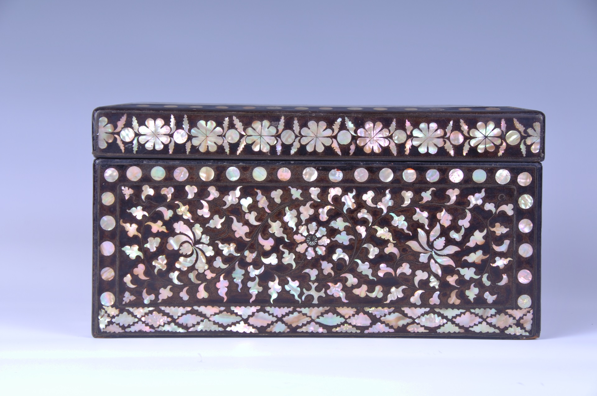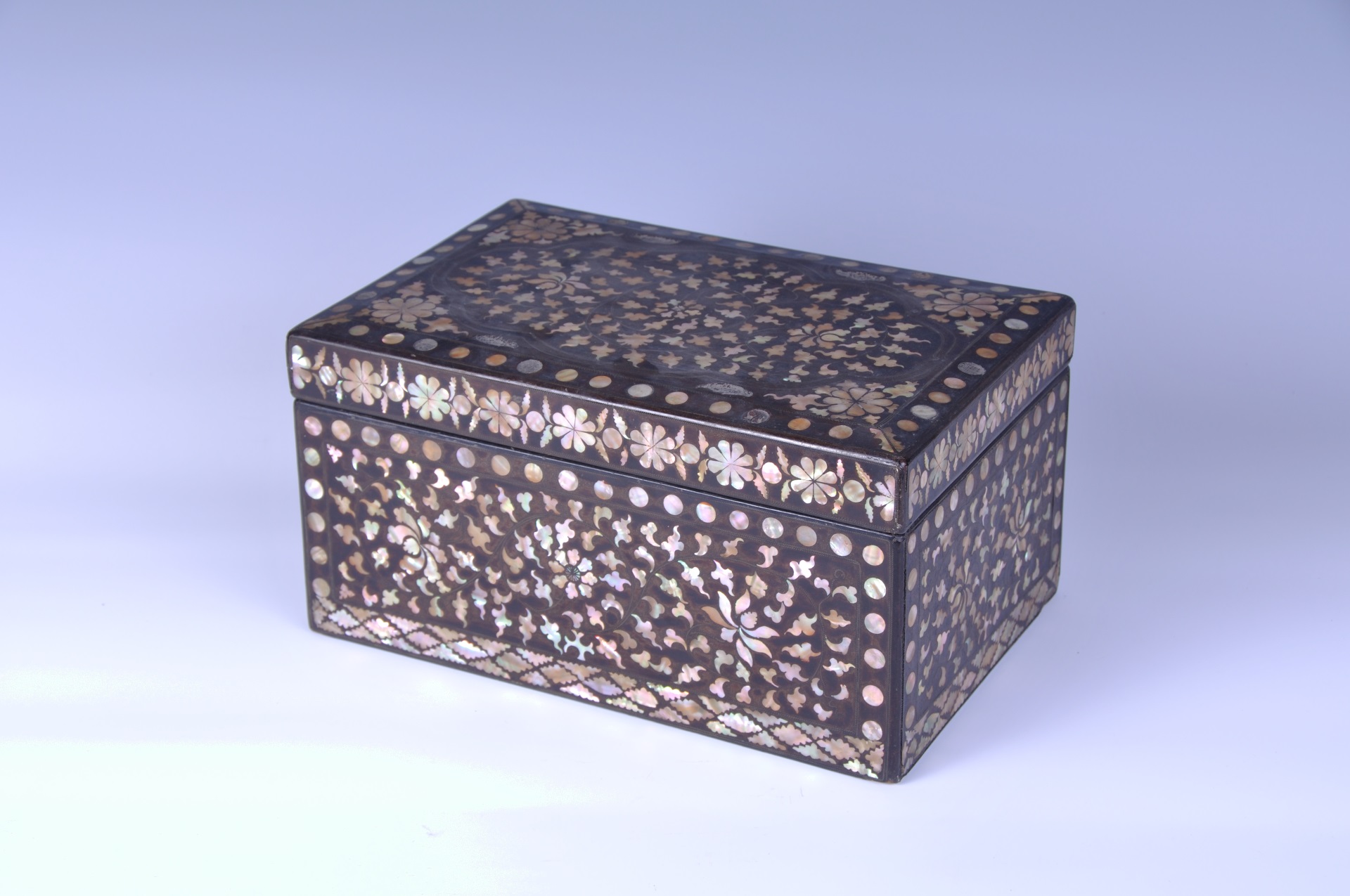 盒呈长方形,子母口,盒中有屉,器身黑漆嵌螺钿装饰。盖面菱形开光内饰缠枝花卉纹,四角为朵花纹,外围为一周圆珠纹;盖沿饰朵花纹;盒身四面长方形开光内为缠枝花卉纹,周围饰圆珠纹等纹饰。螺钿呈现五彩光泽,与漆面形成强烈对比,颇为精美。