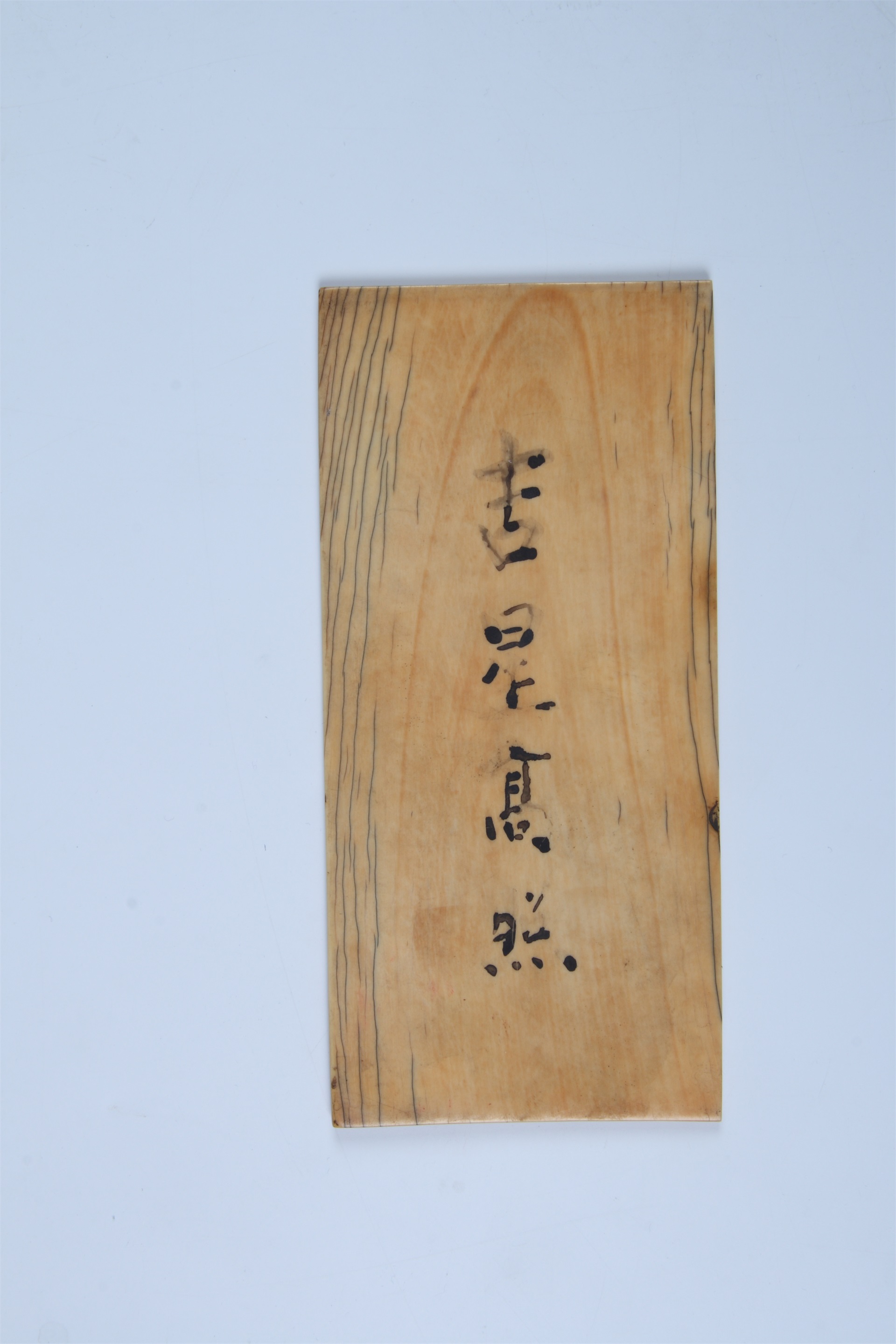 插屏屏心呈长方片状,表面光滑平整,象牙纹理清晰,有自然裂纹。正反两面分别墨书“吉祥高照”、“五谷丰登”等吉祥语。