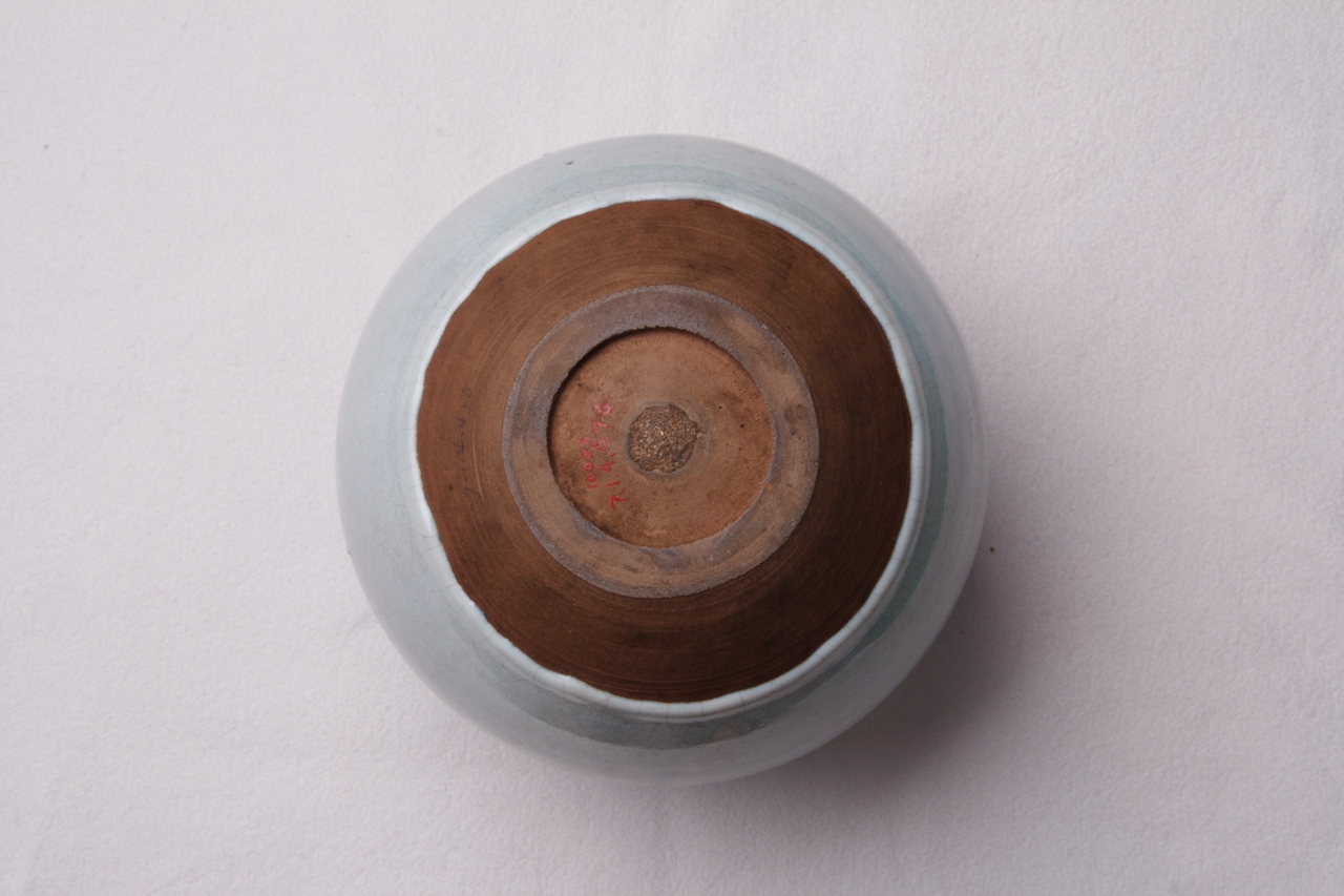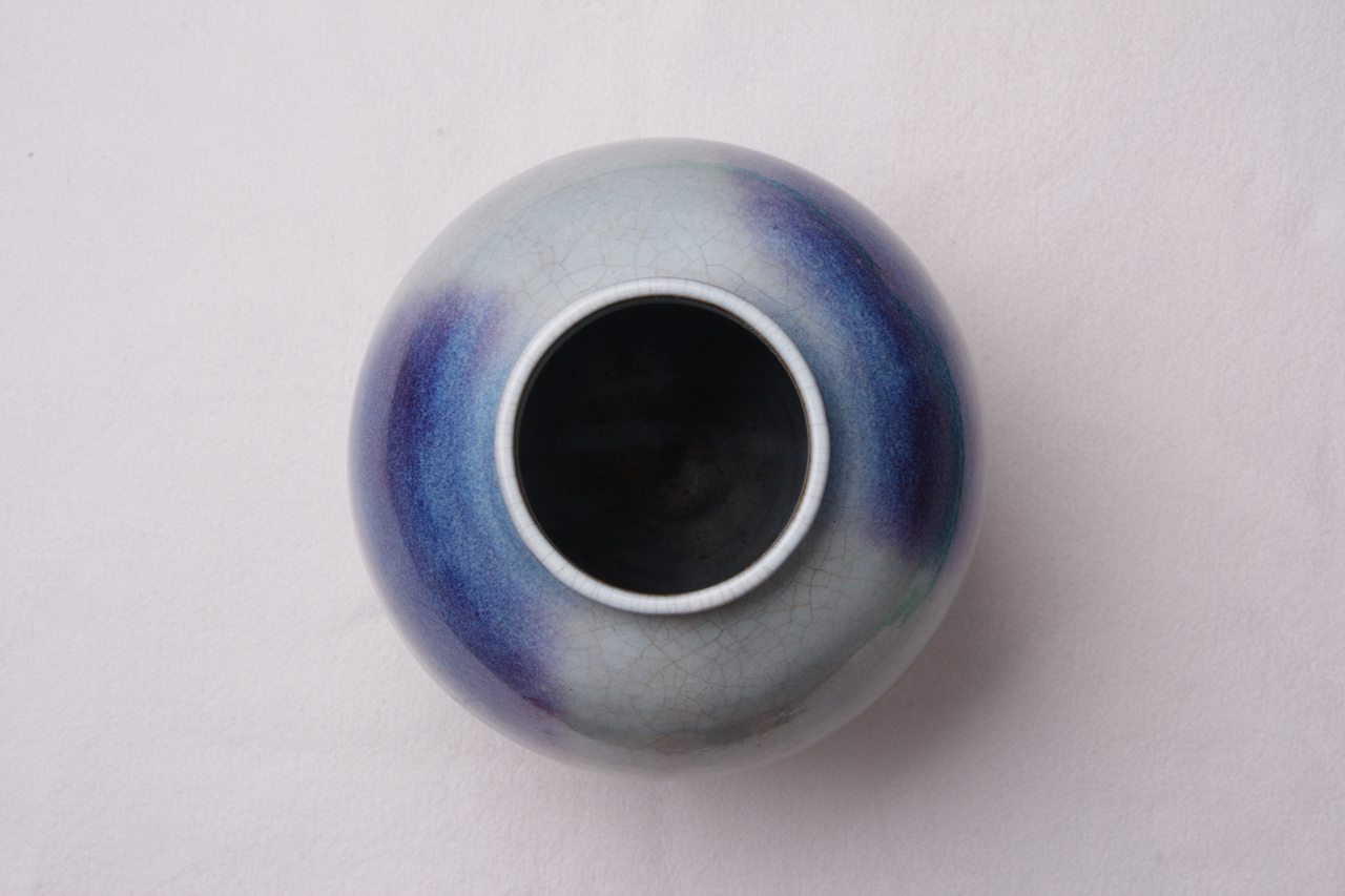 短颈,球腹,通体施淡兰色釉,施釉不到底,口沿和腹部有对称的窑变自然玫瑰彩斑,华丽典雅。