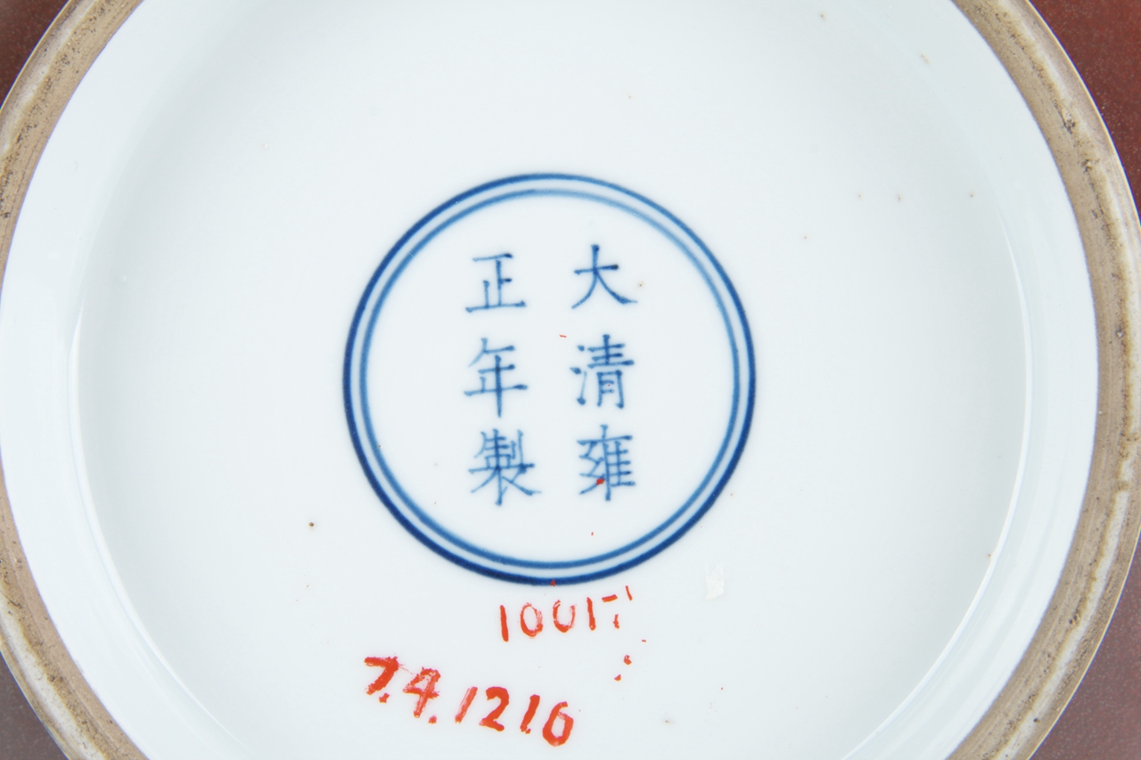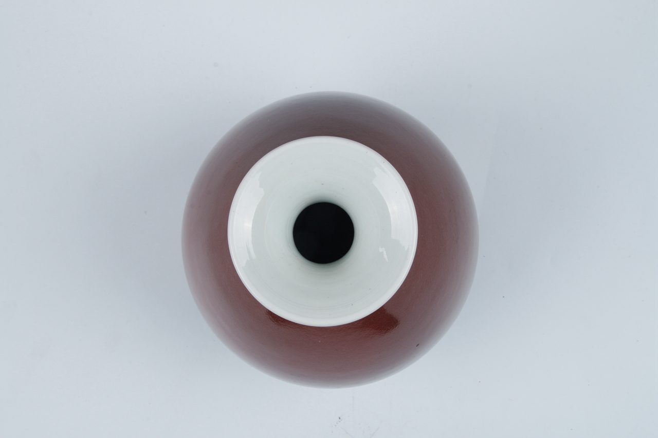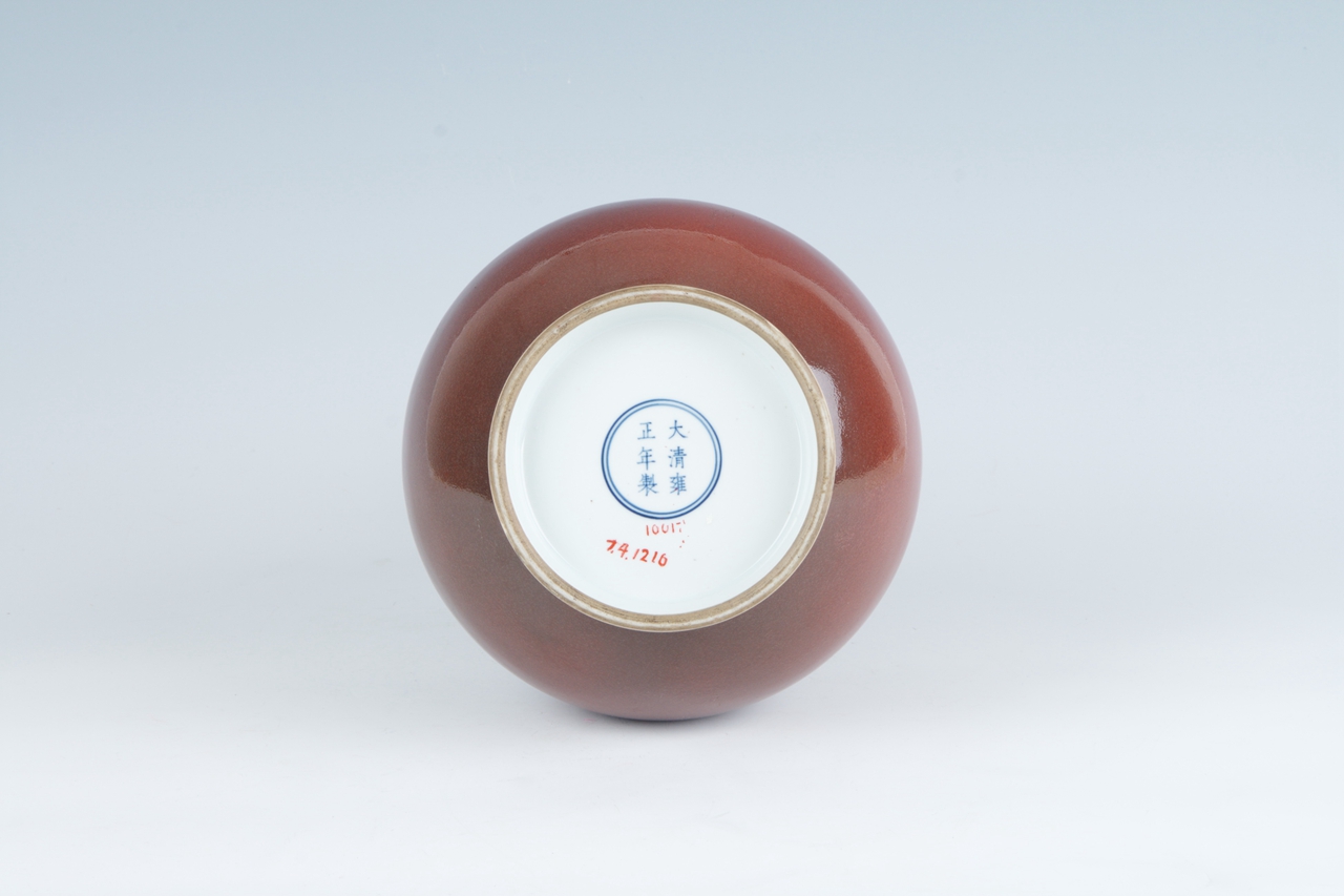 撇口,粗长颈,垂腹,圈足。底内白釉,青花双圈内书有“大清雍正年制”六字青花楷书款。釉呈紫红,润泽有桔皮纹,胎体厚重,瓷质洁白。器型隽秀,典雅优美。
