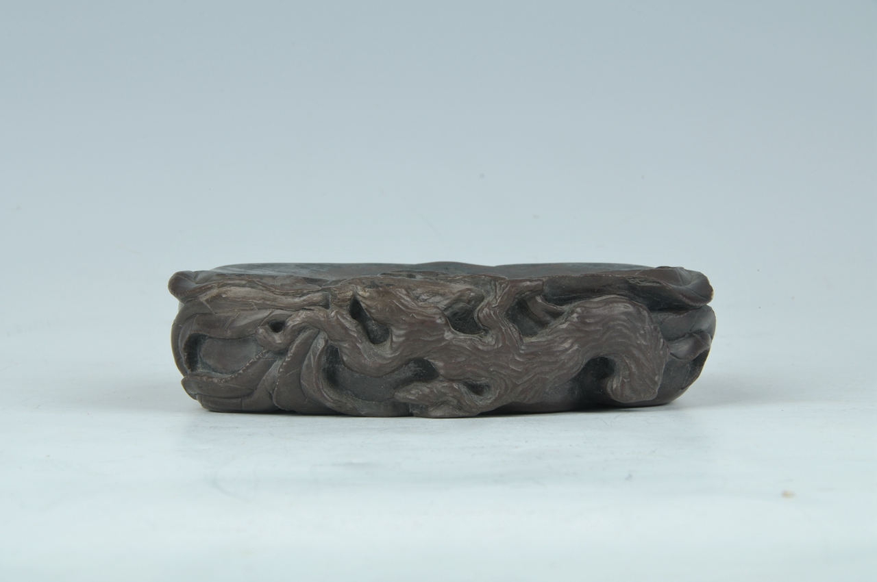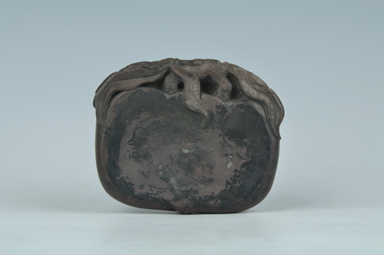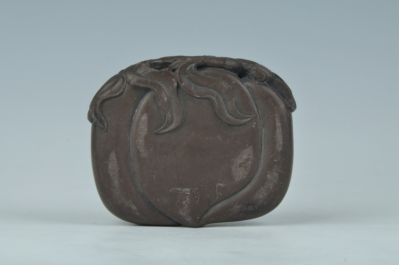 砚为双桃微叠并蒂椭圆形紫色砚,砚身大部以双桃作砚堂,右面比左面稍凹为墨池。桃之双蒂归于一枝,枝上伸出三叶环抱双桃。砚阴为双桃重叠形,由枝伸出三叶附于桃上。左右两侧各附有一片桃叶。砚盒随砚形,竹木为胎涂漆。盒面嵌紫檀似华盖形,刻以荷花纹饰,由盖顶延出六枝紫檀茎脉于盖缘,下面刻以联珠纹饰,构成一幅美丽的图案。