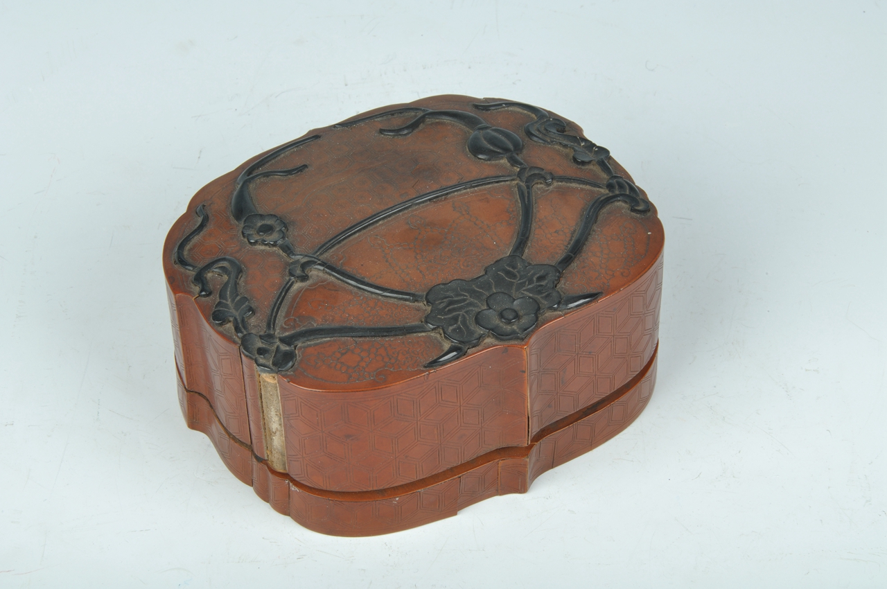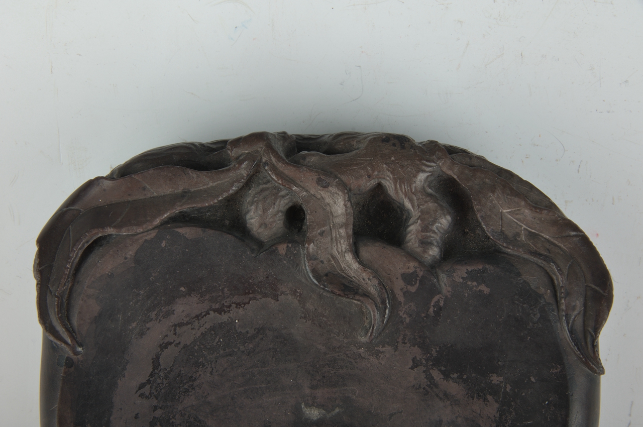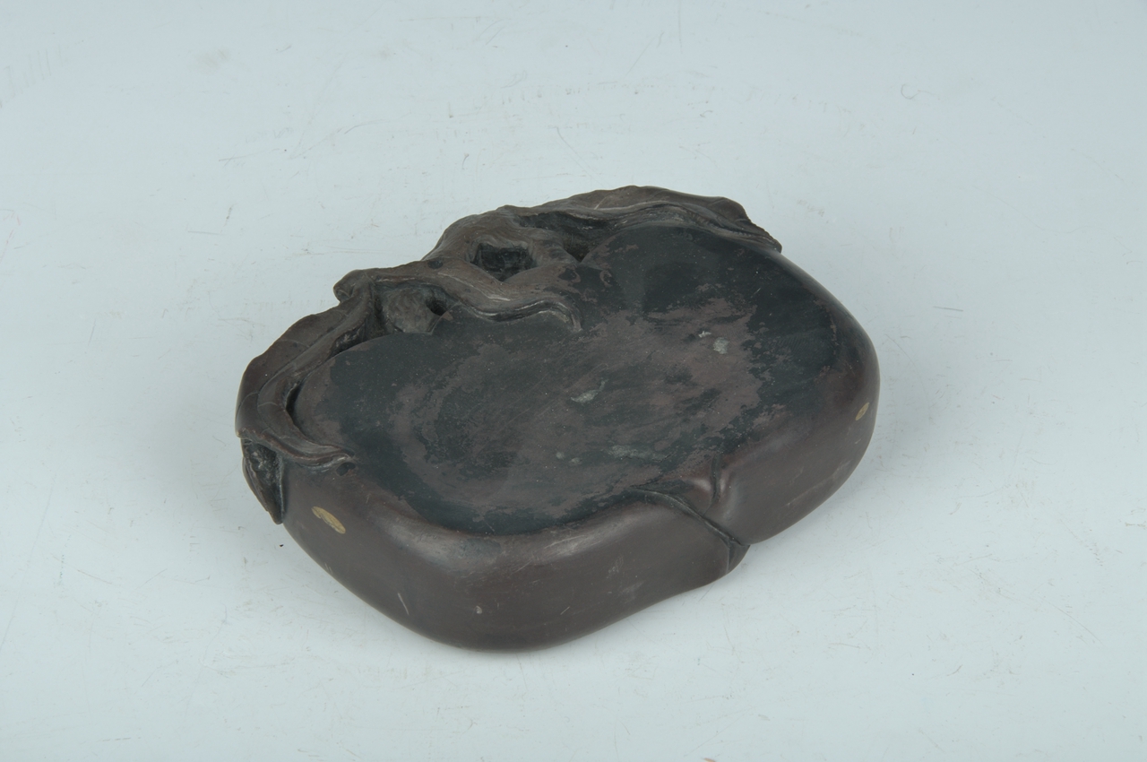 砚为双桃微叠并蒂椭圆形紫色砚,砚身大部以双桃作砚堂,右面比左面稍凹为墨池。桃之双蒂归于一枝,枝上伸出三叶环抱双桃。砚阴为双桃重叠形,由枝伸出三叶附于桃上。左右两侧各附有一片桃叶。砚盒随砚形,竹木为胎涂漆。盒面嵌紫檀似华盖形,刻以荷花纹饰,由盖顶延出六枝紫檀茎脉于盖缘,下面刻以联珠纹饰,构成一幅美丽的图案。