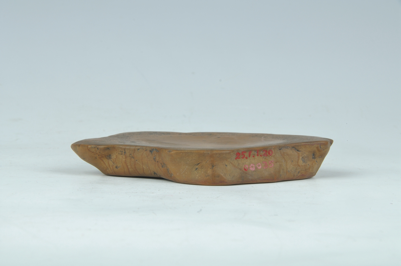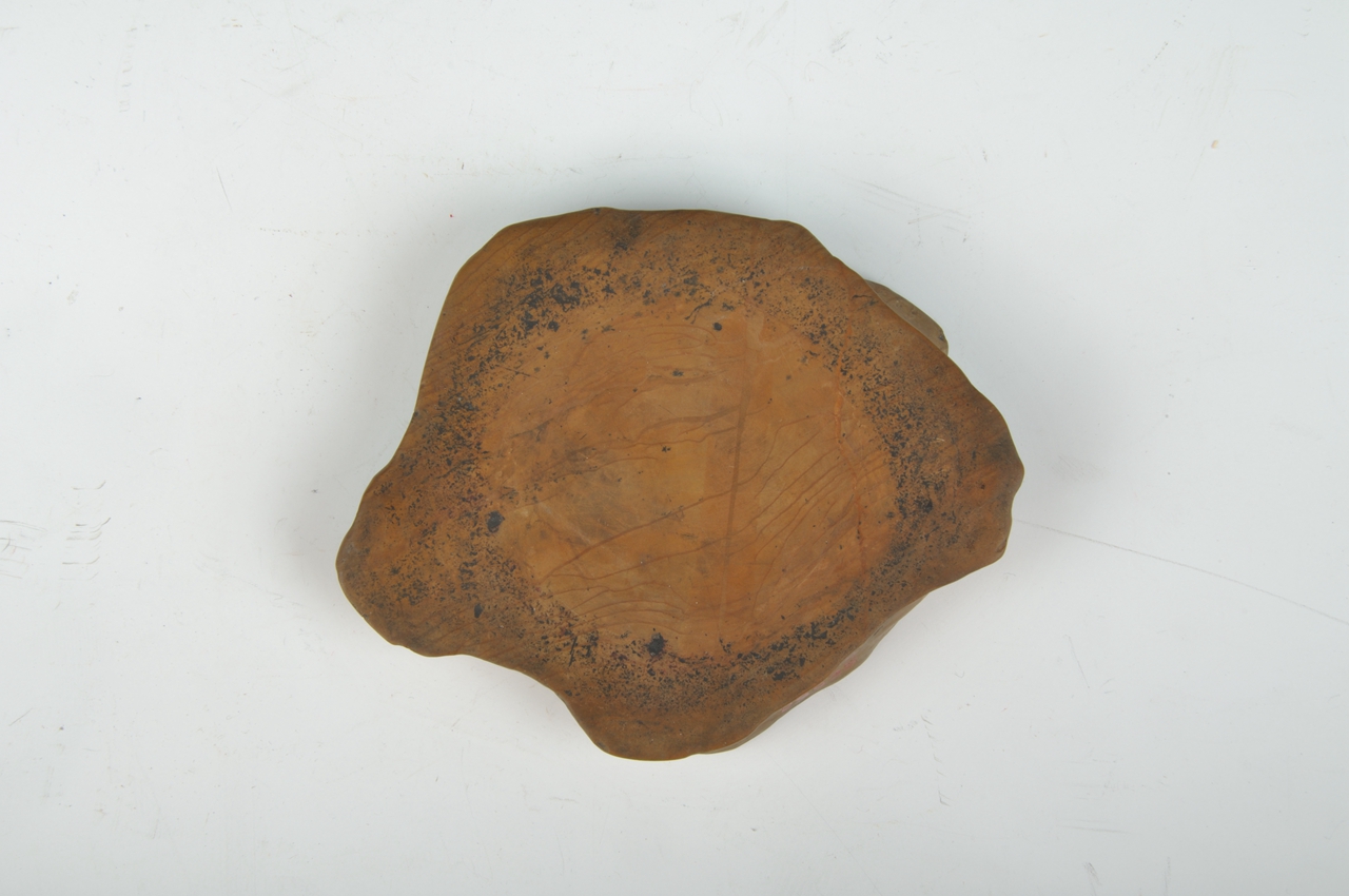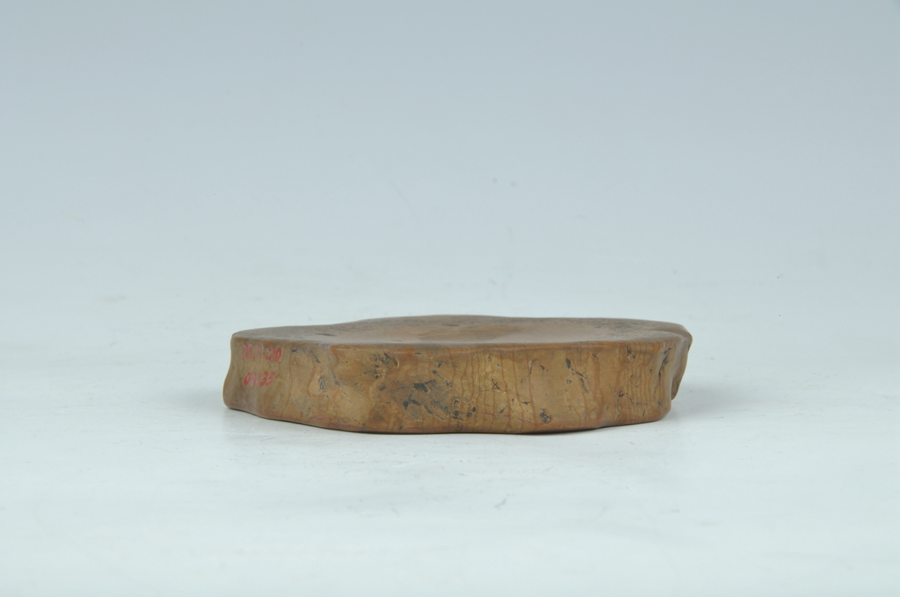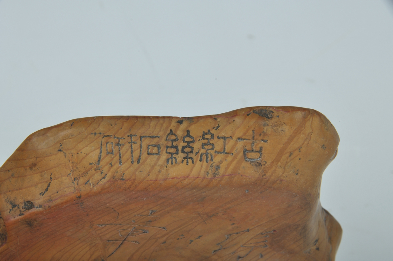 红丝石砚呈不规则天然扁石形,边刻篆书“古红丝石研”,底刻行书“丝编文章,一峰”。砚内随石形有曲状红丝如线。