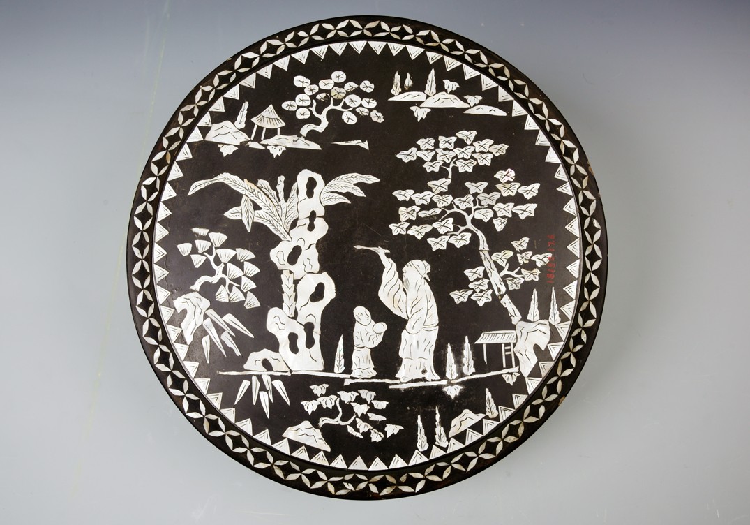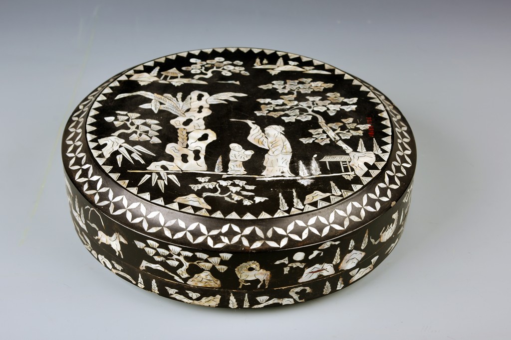 圆形盒,由盖、底两部分组成。盖面饰主体图案,用螺钿镶嵌出山水树石,一老者挥笔似写生作画状,小童端砚侍奉。盒外壁嵌八骏及树石等图案。