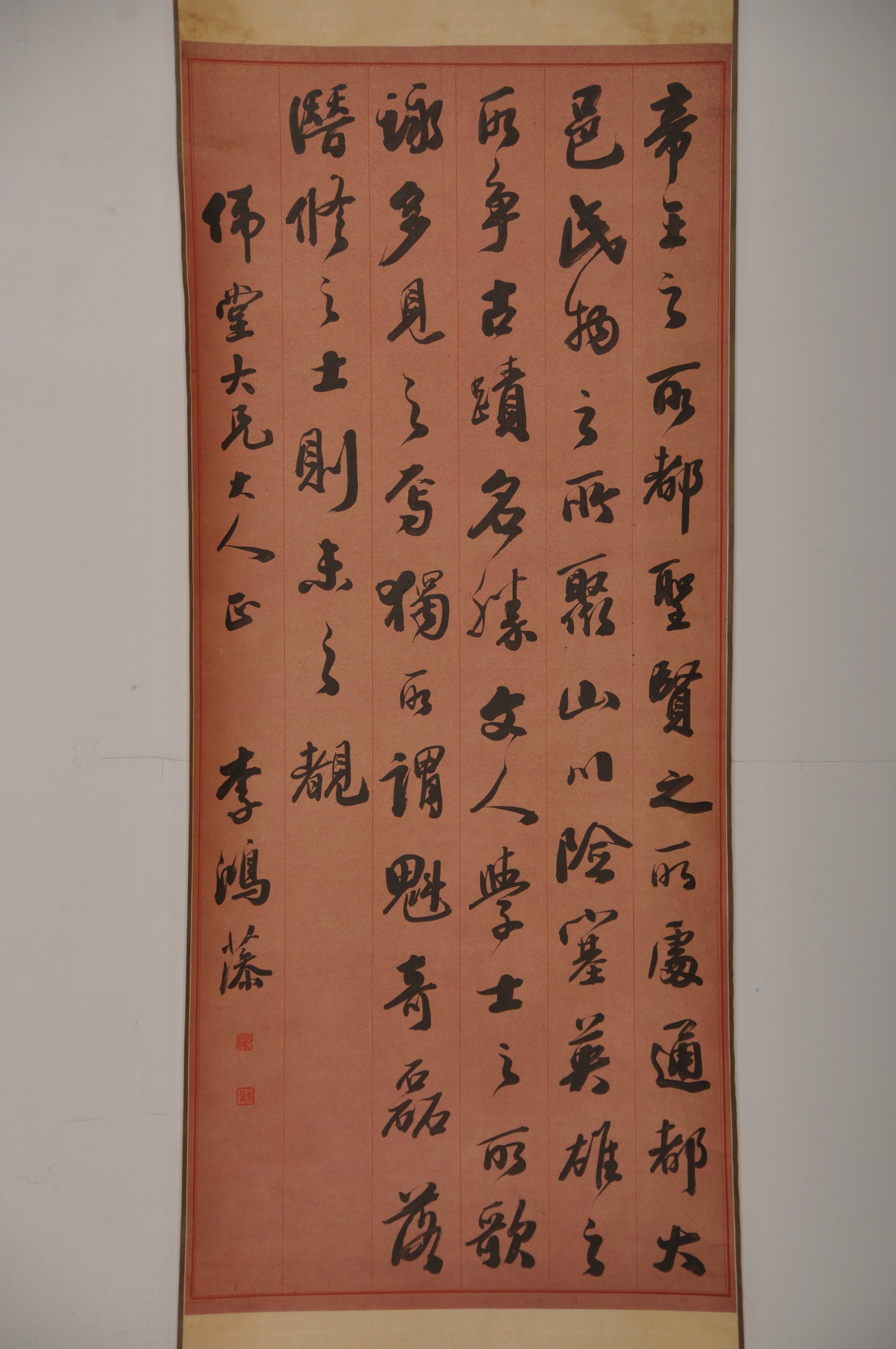 | 1514 | 清李鸿藻桃红冷宣行书立轴 | 清 | 通长165.2 通宽71.8 | 查看 |