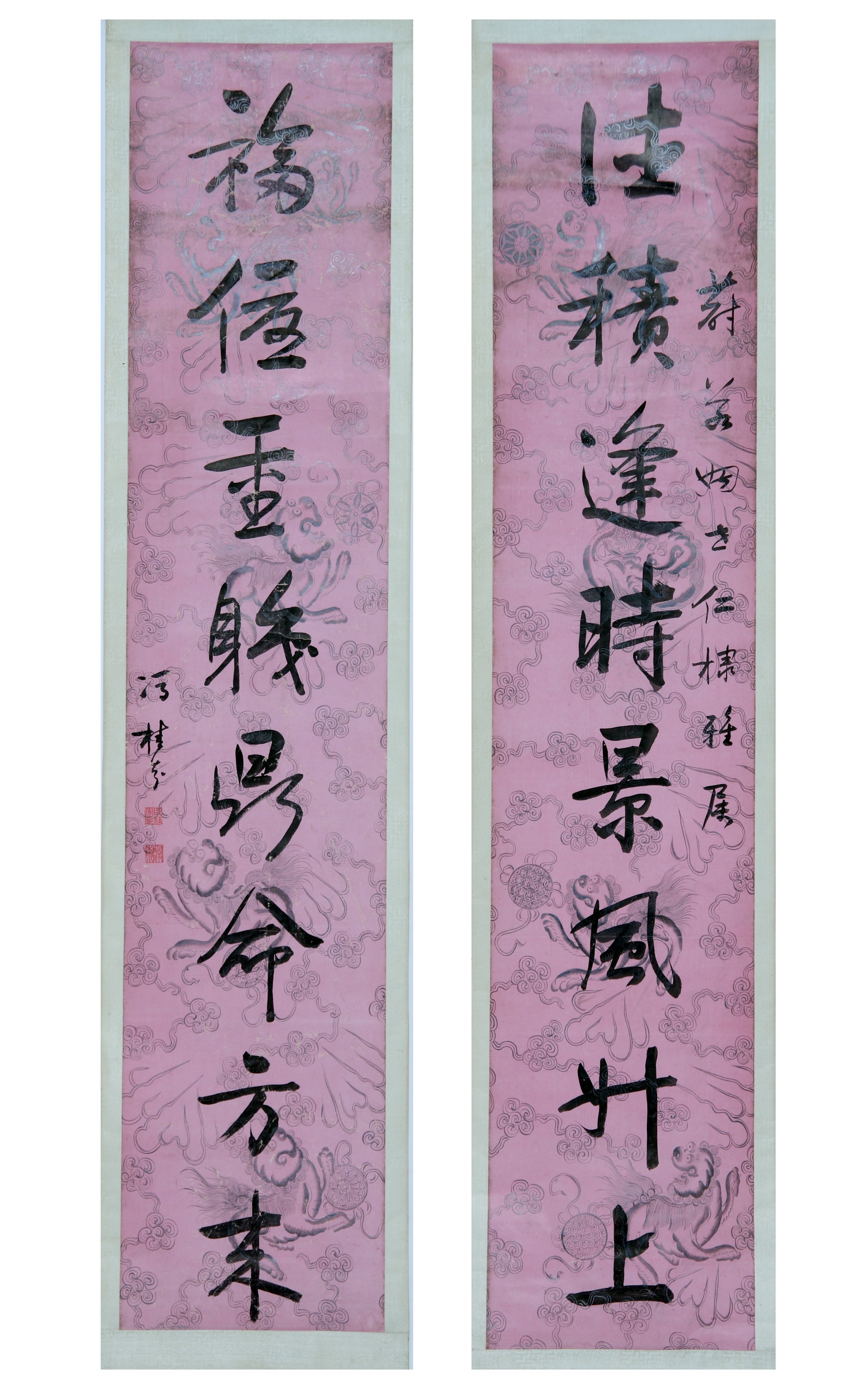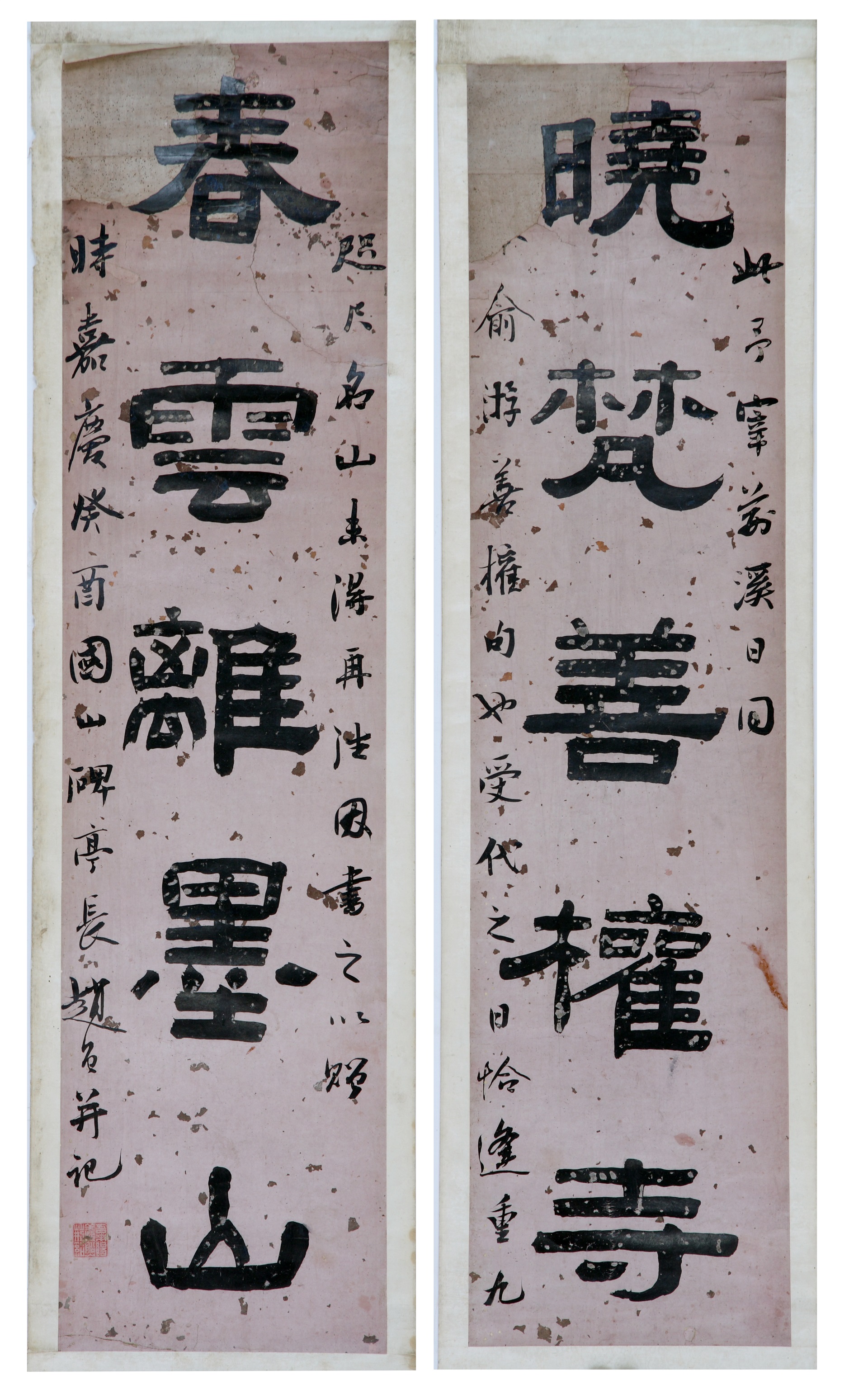 | 1823 | 清赵勇桃红洒金笺隶书五言联 | 清 | 裱纵 150 横37. | 查看 |