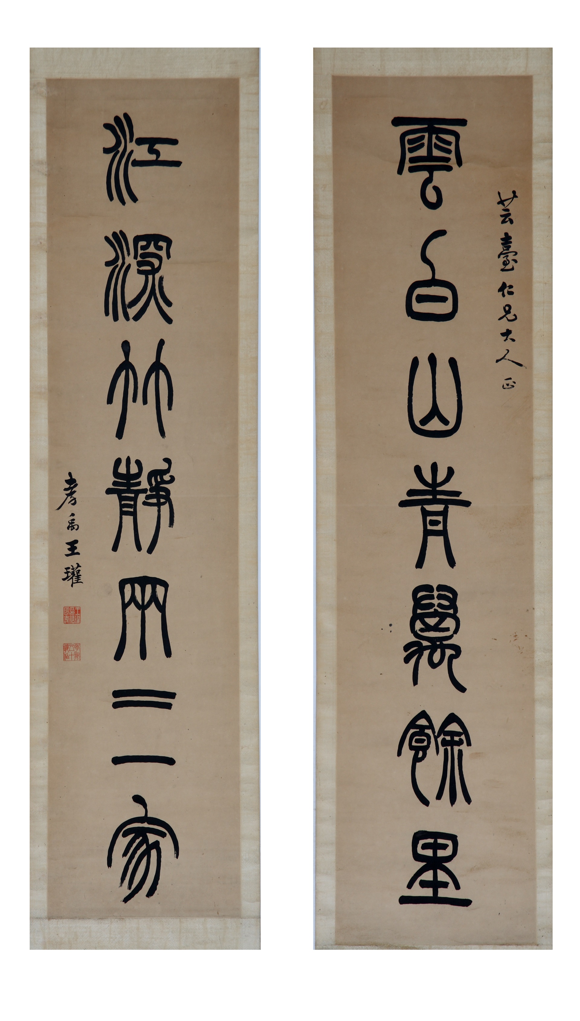 | 1836 | 清王瓘纸本篆书七言联 | 清 | 通长129.5 通宽29.6 | 查看 |