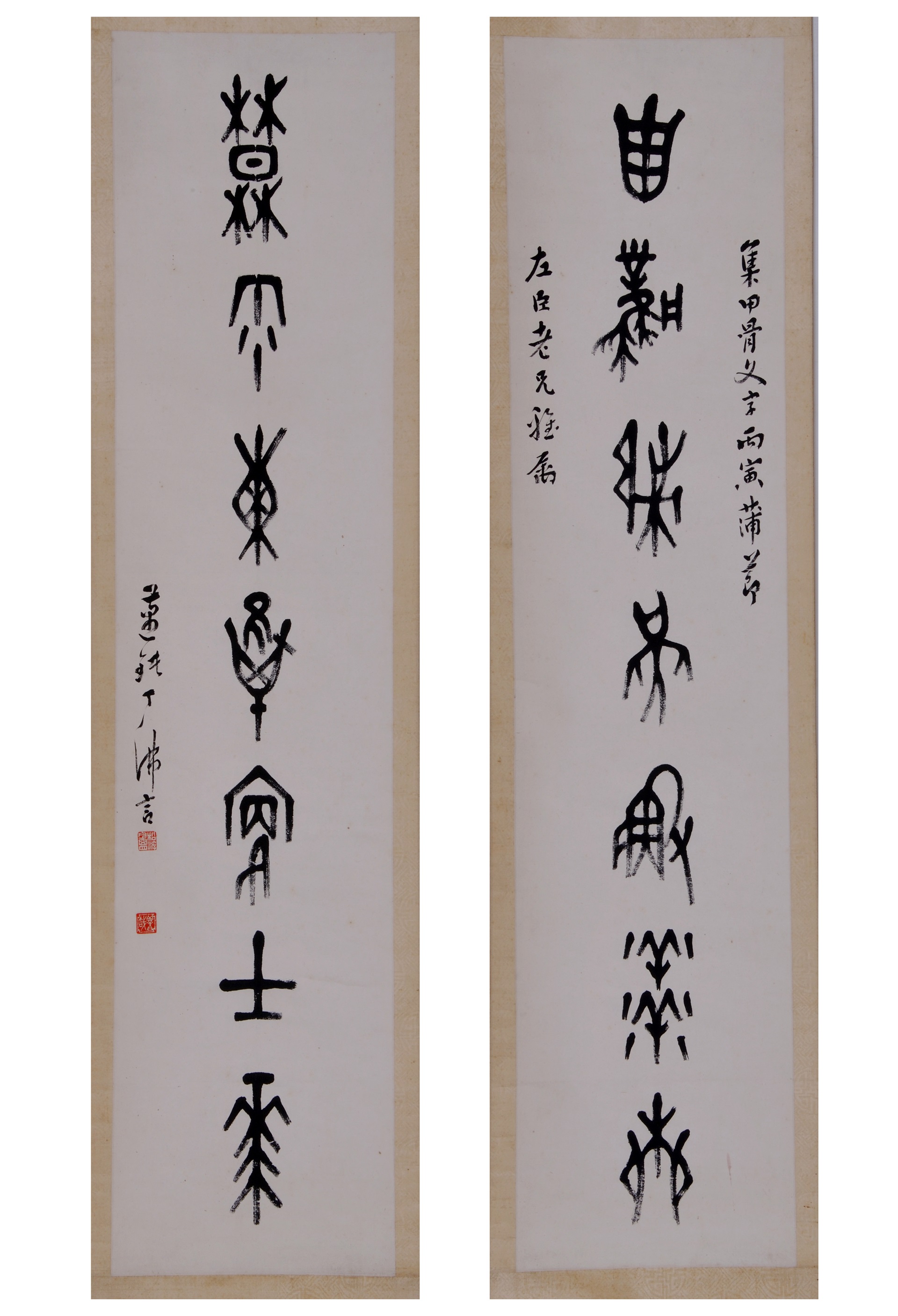 | 2701 | 清至民国丁佛言纸本甲骨七言联 | 清至民国 | 通长131 通宽30 | 查看 |