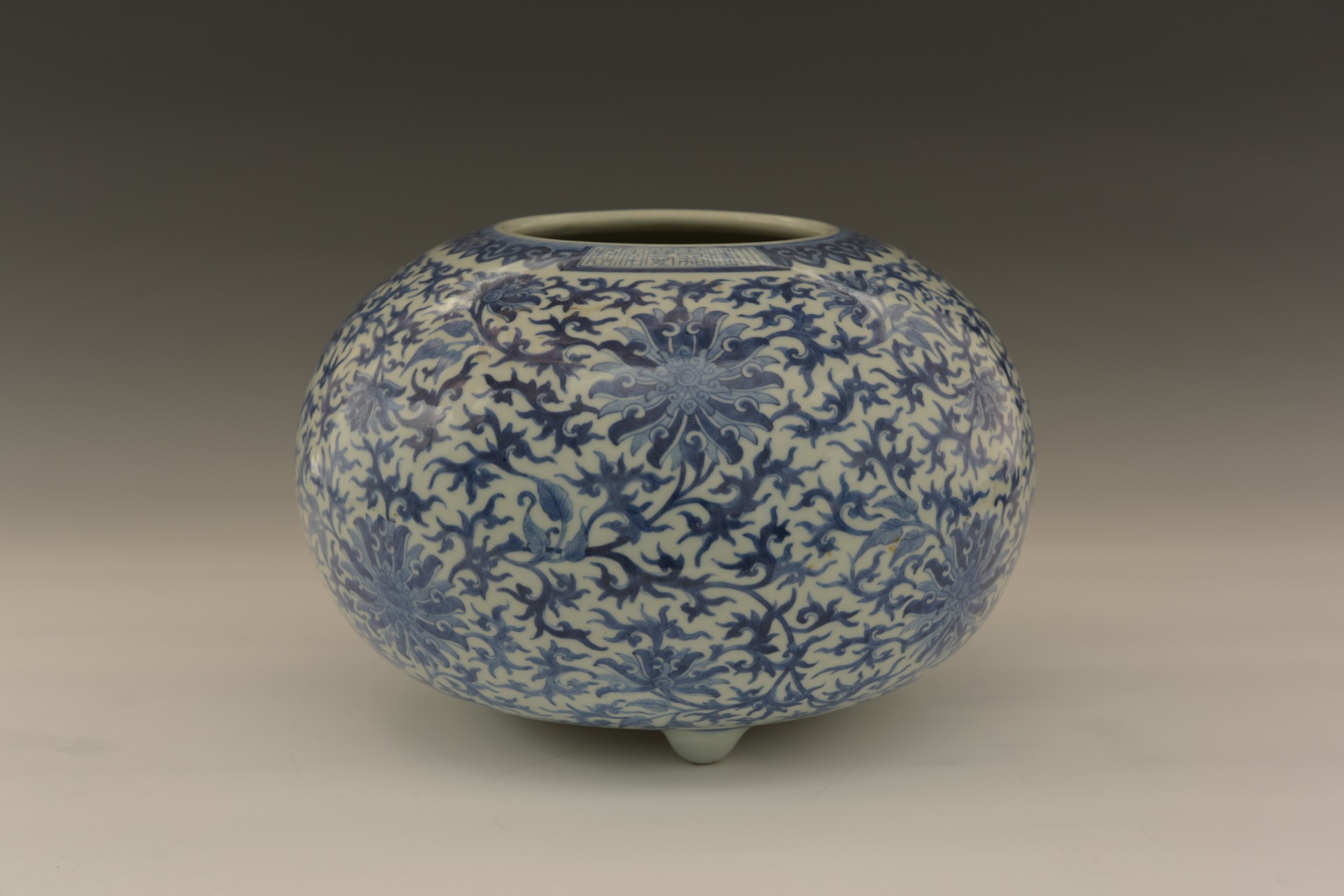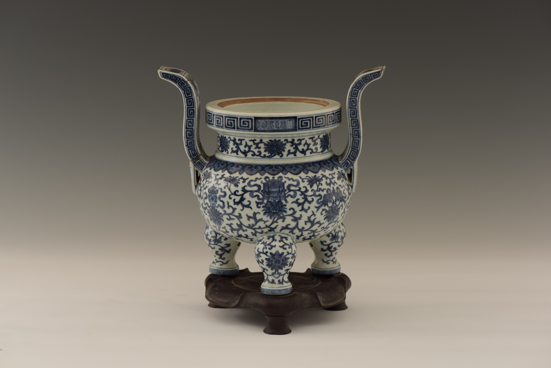 | 353 | 清嘉庆青花缠枝莲托八宝纹三足瓷炉 | 清 | 通高23.8口径15厘米 | 查看 |