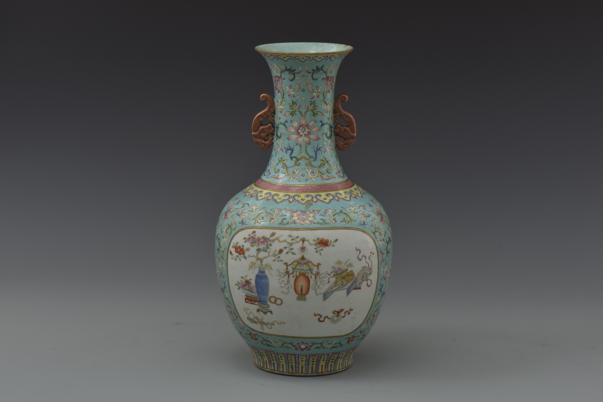 | 354 | 清嘉庆绿地开光花卉纹双耳瓷瓶 | 清 | 通高33.8口径10.1厘米,腹径19厘米 | 查看 |
