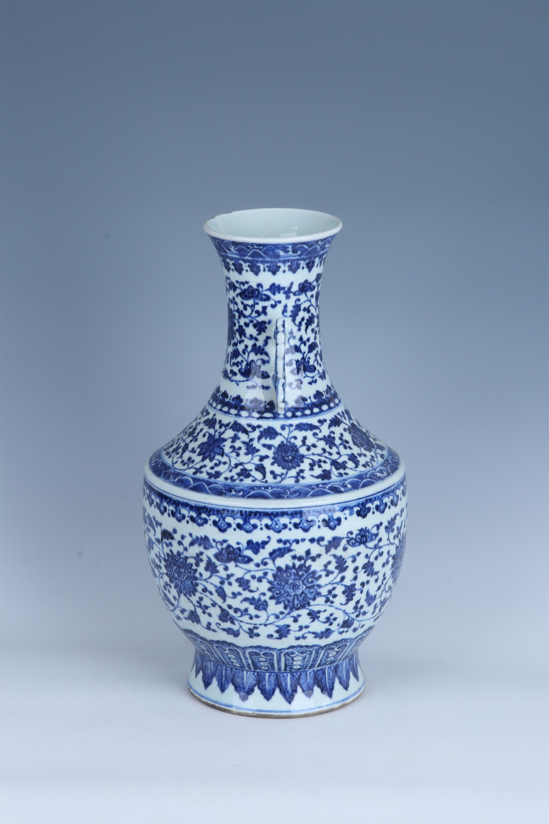 | 974 | 清雍正青花缠枝莲纹螭耳瓷瓶 | 清 | 通高46口径13腹径25.5底径17.5厘米 | 查看 |