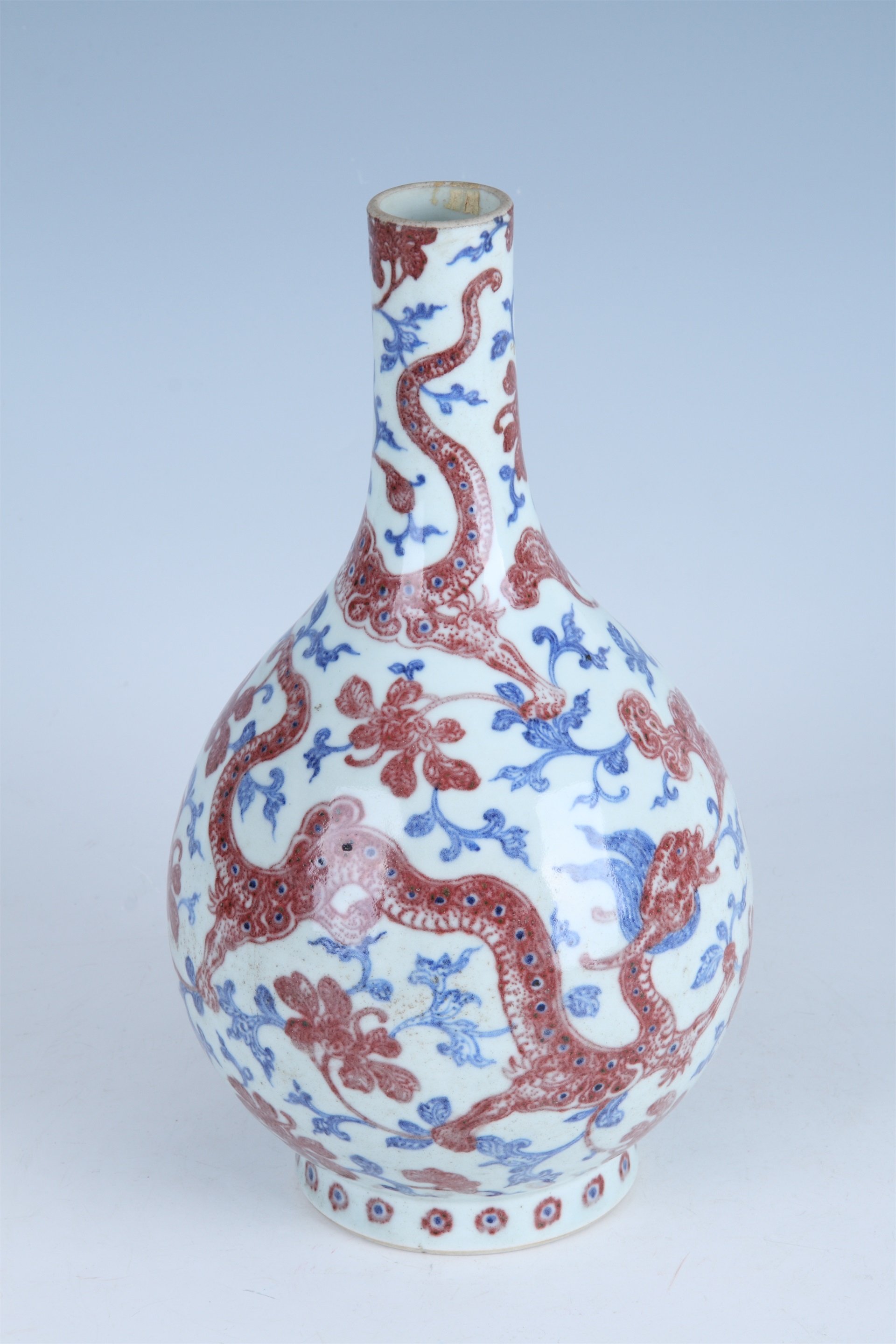 | 1046 | 清乾隆青花釉里红龙穿花纹长颈瓷瓶 | 清 | 通高29.8 口径4,腹径17,底径9.8厘米 | 查看 |