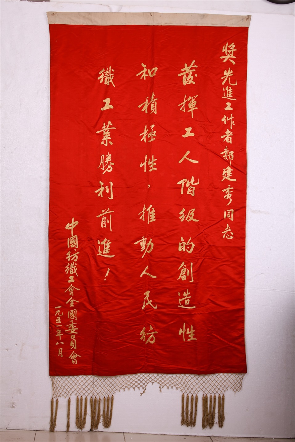 9 1951年中国纺织工会全国委员会授予郝建秀同志的锦旗 公元20世纪 通长172 通宽100 查看