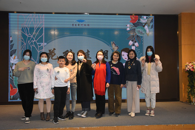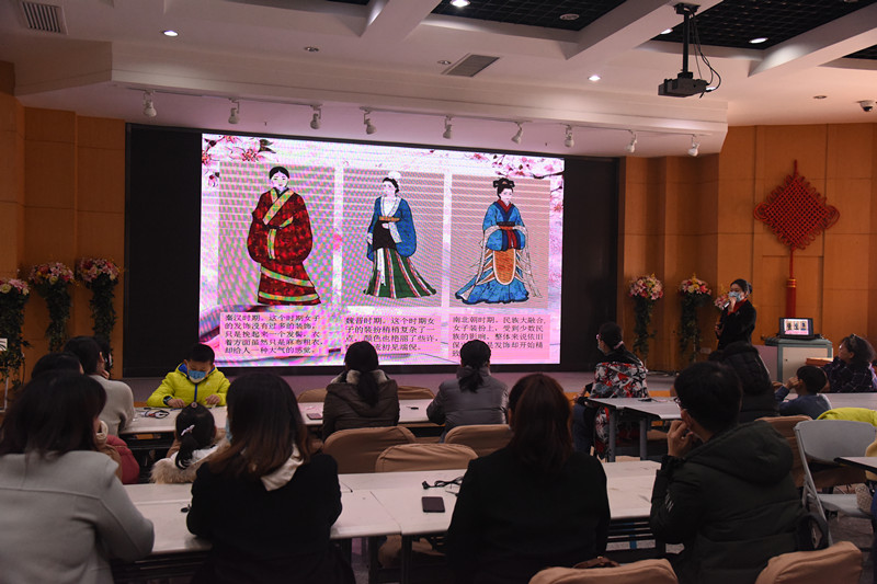 3月7日上午,参加活动的观众早已齐聚二楼报告厅。参与活动的不仅有手牵孩童的年轻妈妈,也有满头银发的阿姨,还有朝气蓬勃的情侣。主持人首先介绍了“国际妇女节”的历史由来和重大意义,然后梳理的中国历史上有关女性的节日、服饰、妆容和历史典故,紧接着讲解此次胸花手工制作的流程。