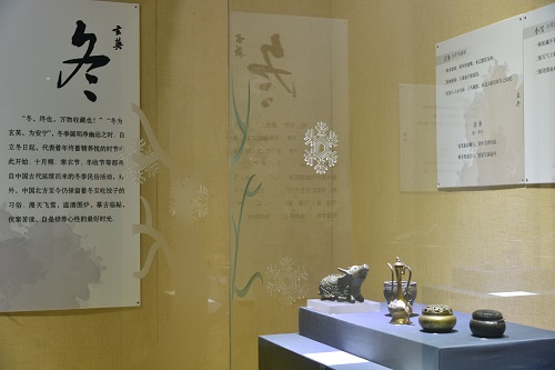 冬季单元,精心选择了古人冬季常用的具有人文美学特征的器物温酒器、手炉、熏炉等,在寒冷的冬夜温上一壶酒,对酒觥筹围炉夜话,是中国古人最热衷追求的暖意。代表之一就是“牛形铜觥”,由盖、身两部分组成,牛腿弯曲跪地,腹身饰饕餮纹,古朴典雅,反映了古人精致的生活态度。