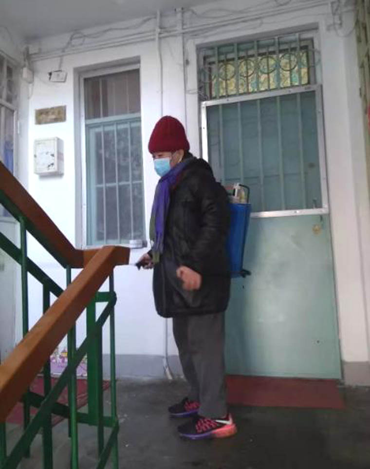 高志华在对楼道进行消杀