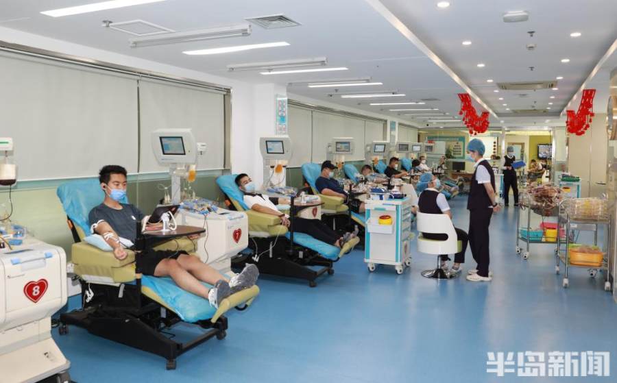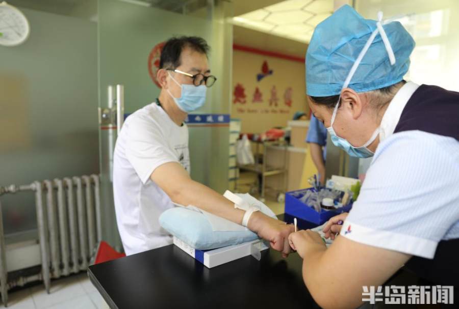 8月1日,青岛市中心血站内,一些退伍军人来到这里撸袖献血奉献爱心,以这种特殊的方式庆祝八一建军节。据了解,从上午开始就有曾经当过兵的市民前来献爱心,听了工作人员介绍后,捐献血小板,他们觉得这种方式庆祝建军节很光荣。