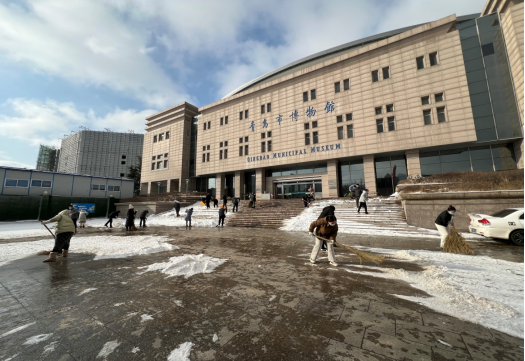 全体党员干部职工团结一致、分工协作,运用铁锹、扫帚、铲雪板等工具,采用“先铲后扫”的方式,对市博物馆门前大台阶、东西馆区院落及周边道路进行扫雪除冰。经过一个多小时的共同奋战,原本布满积雪的地面已被基本清扫干净,及时为参观游客营造了顺畅的“温暖路”,为市民开辟了整洁安全的“安心路”。