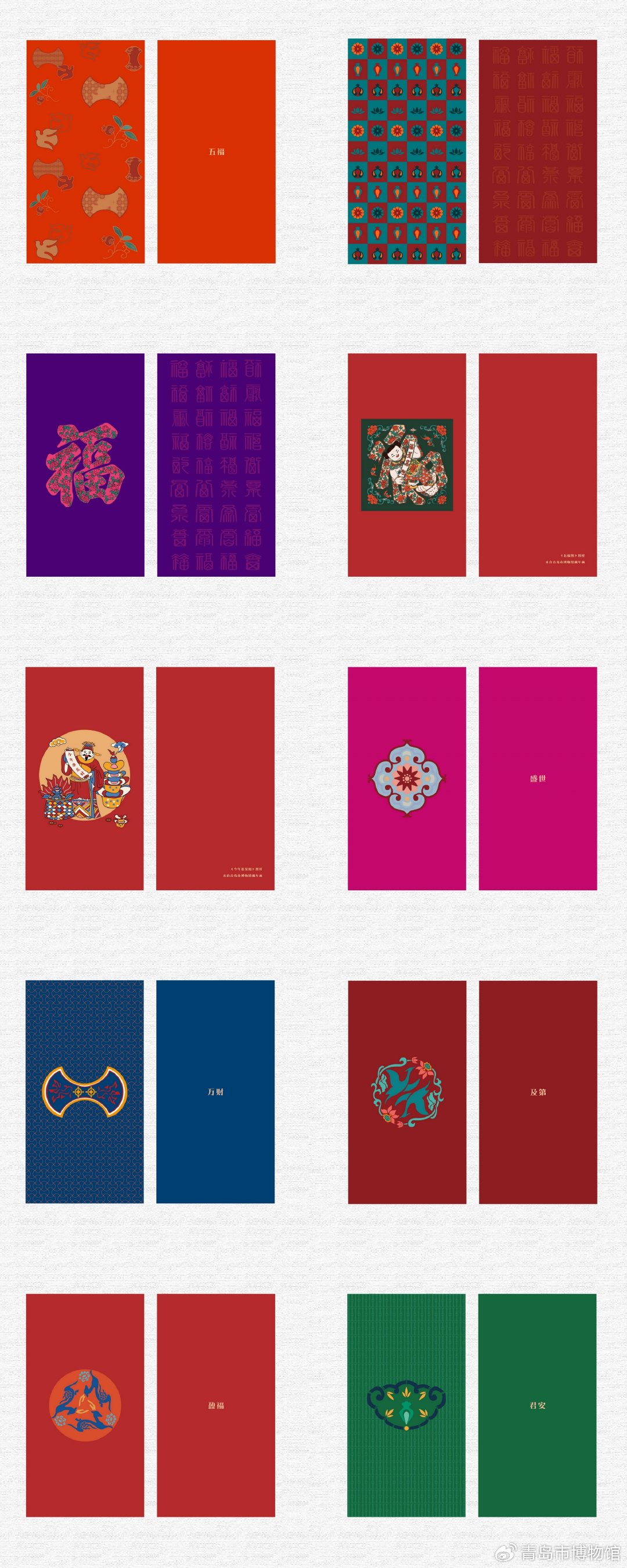 福袋从 馆藏中选取寓意吉祥充满年味的藏品代表,对其中财神、福娃、祥云、元宝、卷轴以及各种寓意吉祥美好的动物、花卉图案进行提炼,结合其版画年画的喜庆形式进行设计。