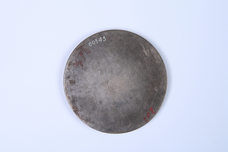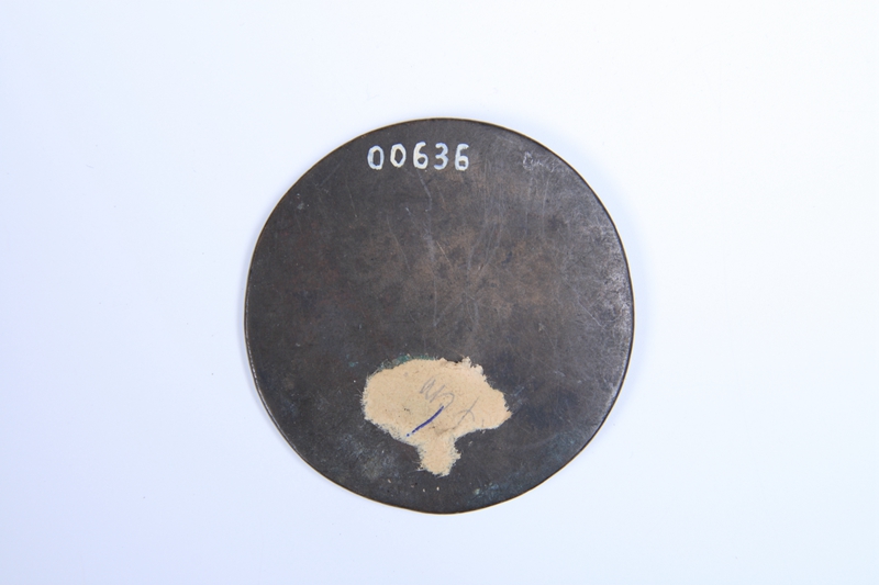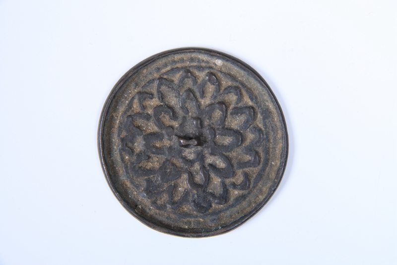 明代。直径5.4厘米,重40克,圆形,小钮,镜背饰有一朵盛开的西番莲花纹,近边处一周连珠纹,窄边,胎体轻小,1950年入藏 ,后鉴定为二级文物。