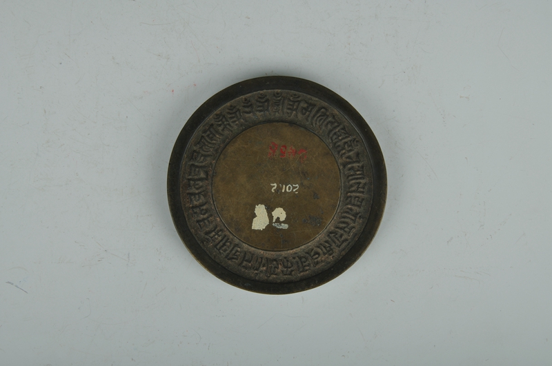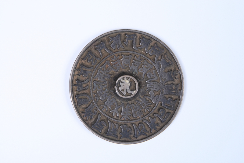明代。圆形,直径9.1厘米,重245克,圆柱形钮,钮顶面饰一梵文,钮外饰一周梵文十六个字,再外一周饰二十个梵文字,文字内容不可考。素窄缘,胎体较重较厚。铜镜极具明代铜镜构图疏简、质地厚重的特点,上面出现的梵文铭文,给整件铜镜更增添了一抹宗教的神秘色彩。1950年收入 馆藏,后鉴定为三级文物。