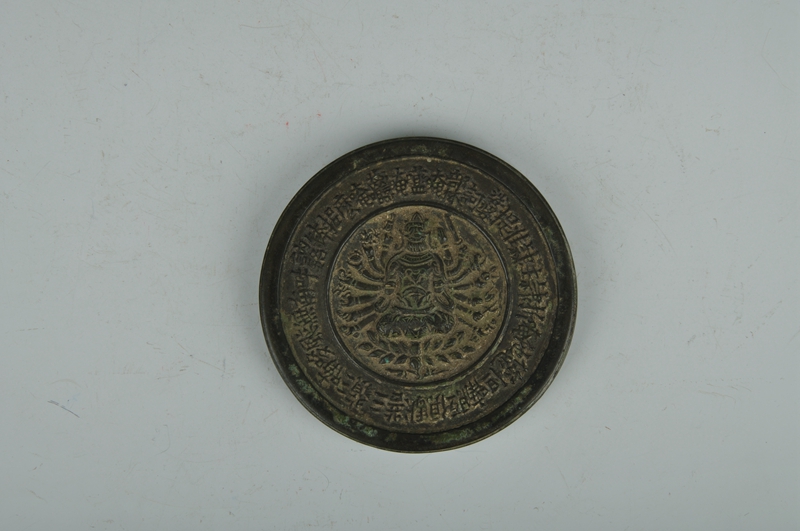 在上述铜佛镜中还有一个引人注目的浮雕像——千手观音,千手观音又称千手千眼观世音、千眼千臂观世音等,是我国民间信仰的四大菩萨之一。镜中的千手观音造型优美,与镜上梵文相映衬,极具佛教色彩,反映了制作者对佛教的崇拜、喜爱之情,而此类铜镜据说一般被悬挂在佛寺大殿上作驱邪之用。