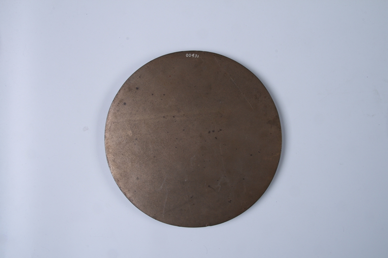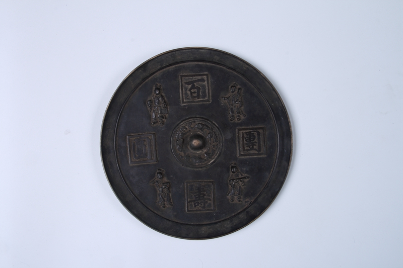 明代。直径24.5厘米,重约2557克。圆形铜镜,圆钮,仿汉龙钮座,钮座上下左右各有一个凸起的方框,框内有楷书合为“百寿团圆”四字铭,各字之间饰一文物。四人持不同物品,惜已辨识不清。双线素凹圈沿,器型较大厚重。1950年入藏 ,后鉴定为三级文物。
